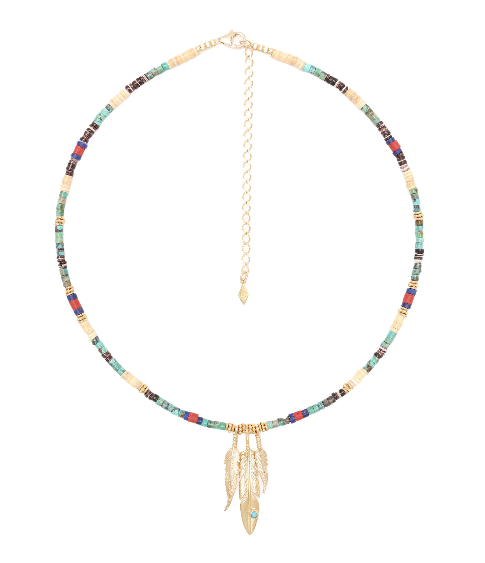 Collier serti de coquillages, bambou, perles, pierres de turquoise et de lapis-lazuli avec au centre trois pendentifs plumes en laiton doré. Fermoir mousqueton avec chaînette de réglage.