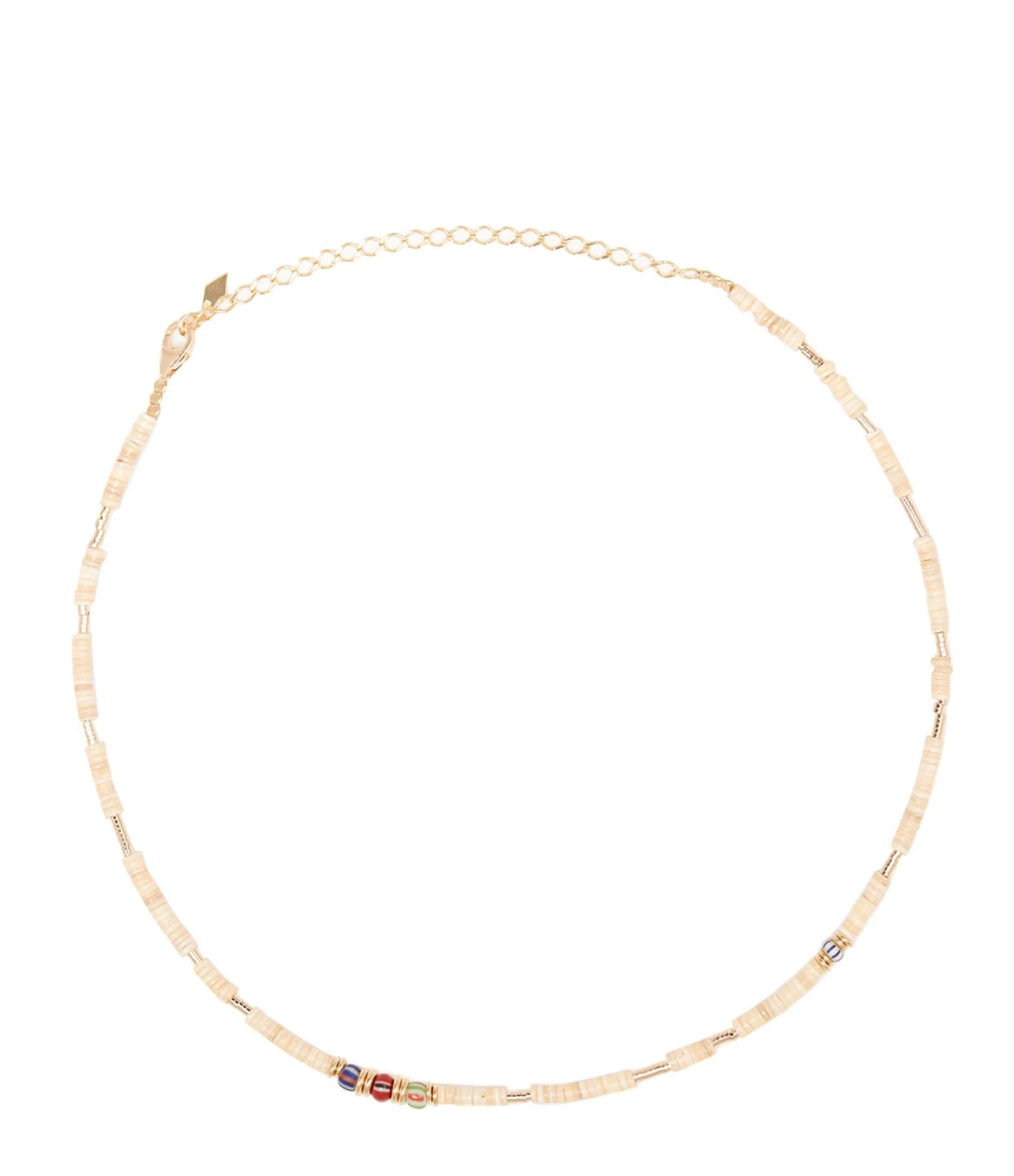 Collier en perles de coquillages et d’ivoire avec des finitions en laiton doré. Fermoir mousqueton avec chaînette de réglage.