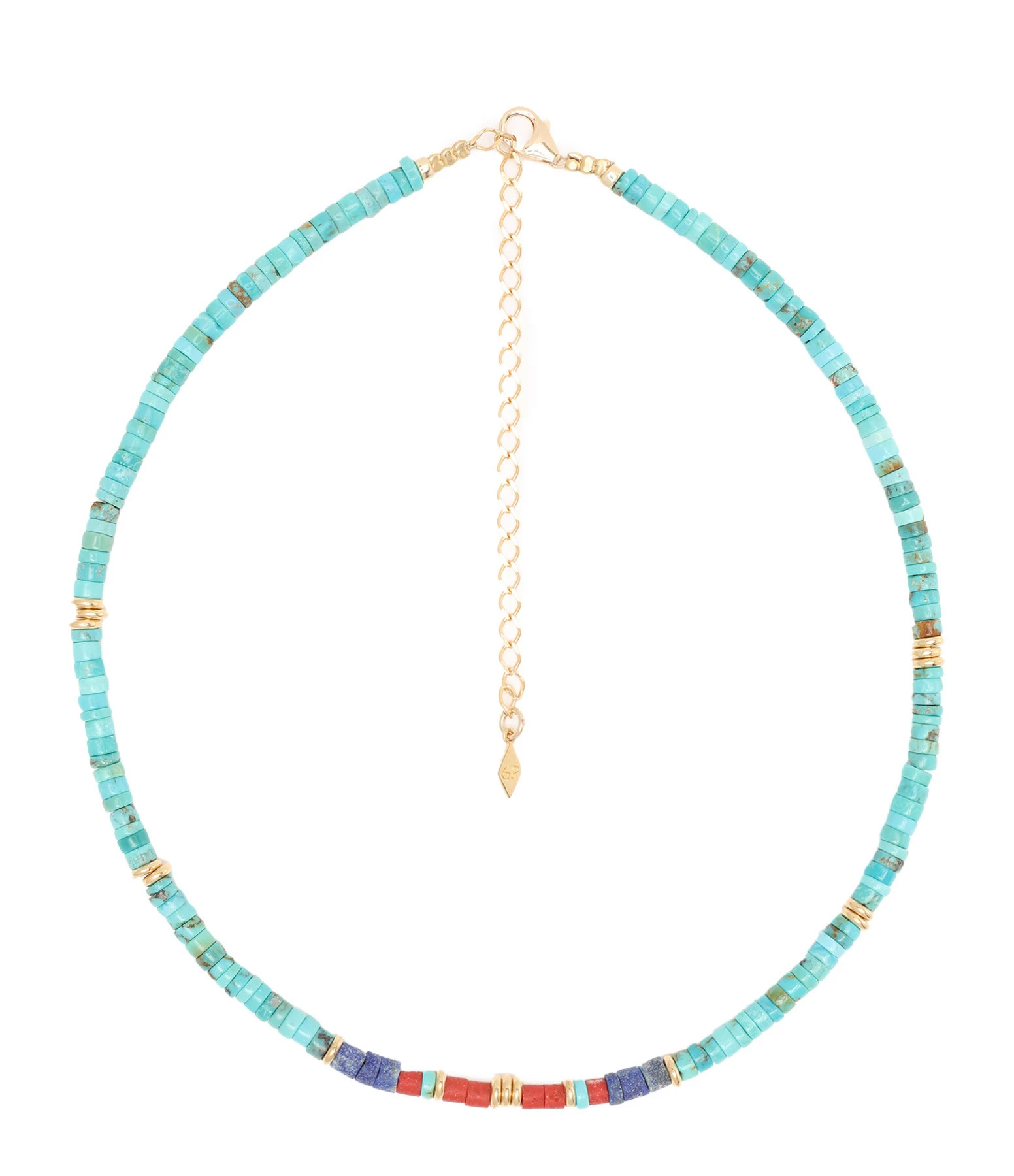 Collier serti de pierres de turquoise, lapis-lazuli, bambou rouge et perles en laiton doré. Fermoir mousqueton avec chaînette de réglage.