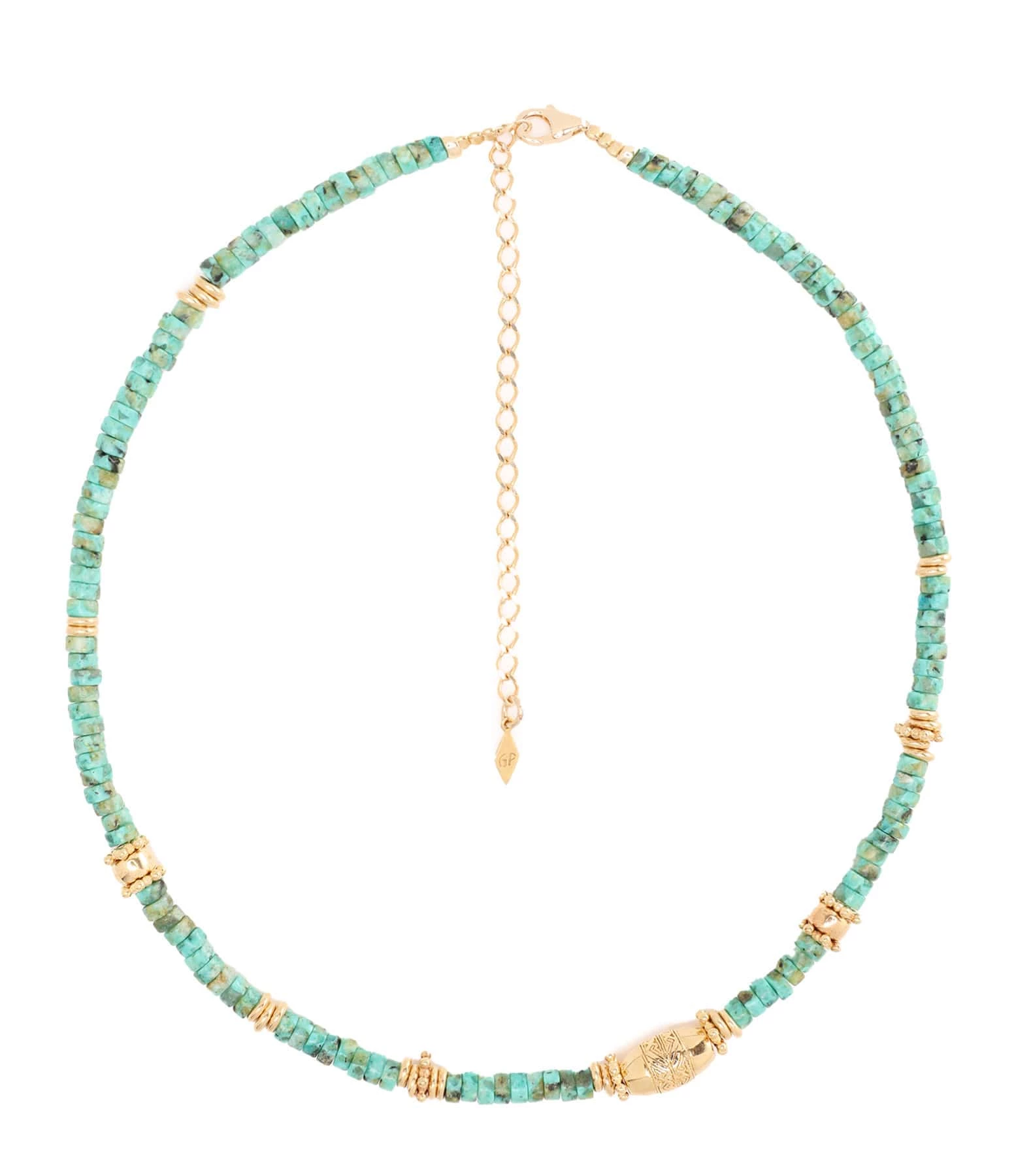 Collier en pierres de turquoise africaines et perles en laiton doré. Fermoir mousqueton avec chaînette de réglage.