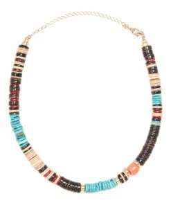 Collier en tubes de coquillages, bambou, pierres de turquoise avec des finitions en laiton doré. Fermoir mousqueton avec chaînette de réglage.