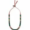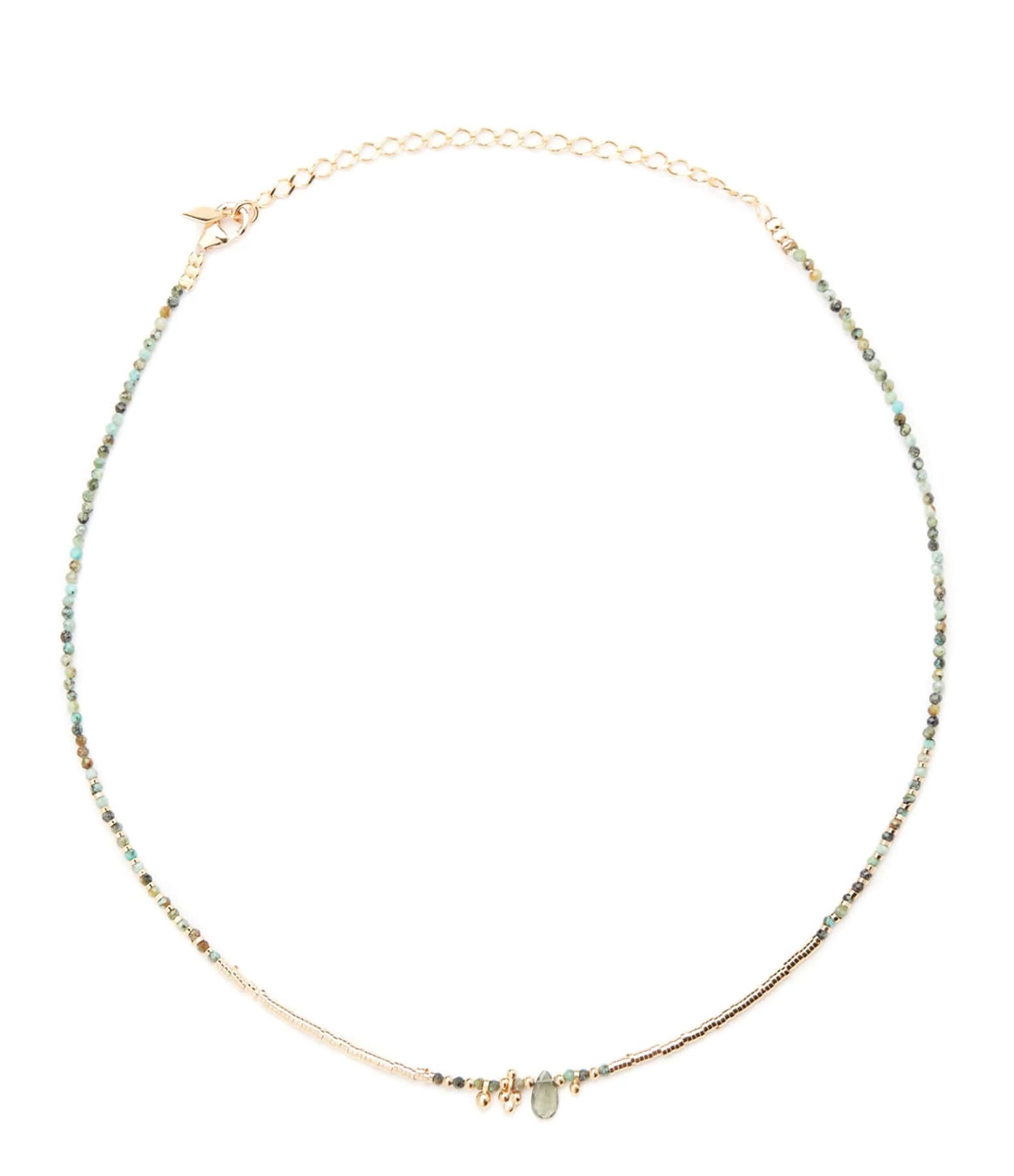 Collier serti de pierres semi-précieuses facettées dans différentes nuances de turquoise et une pierre de saphir avec des finitions en laiton doré. Fermoir classique à mousqueton avec chainette de réglage.