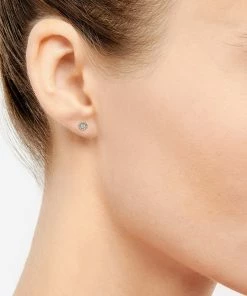 Boucles d’oreilles rondes agrémentées d’un diamant. Fermoir poussette.Vendues à la paire.