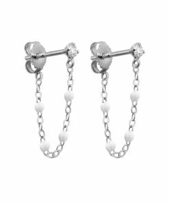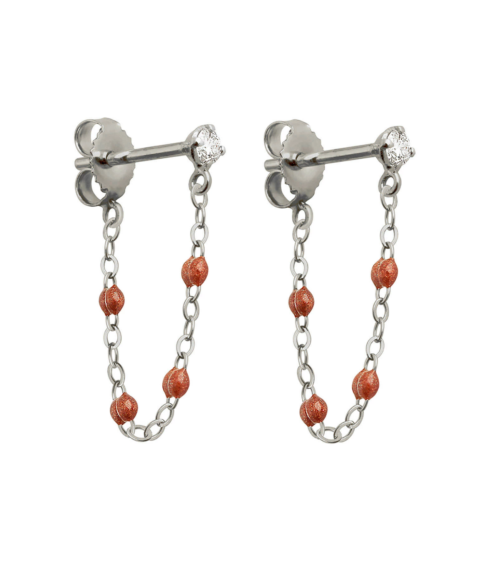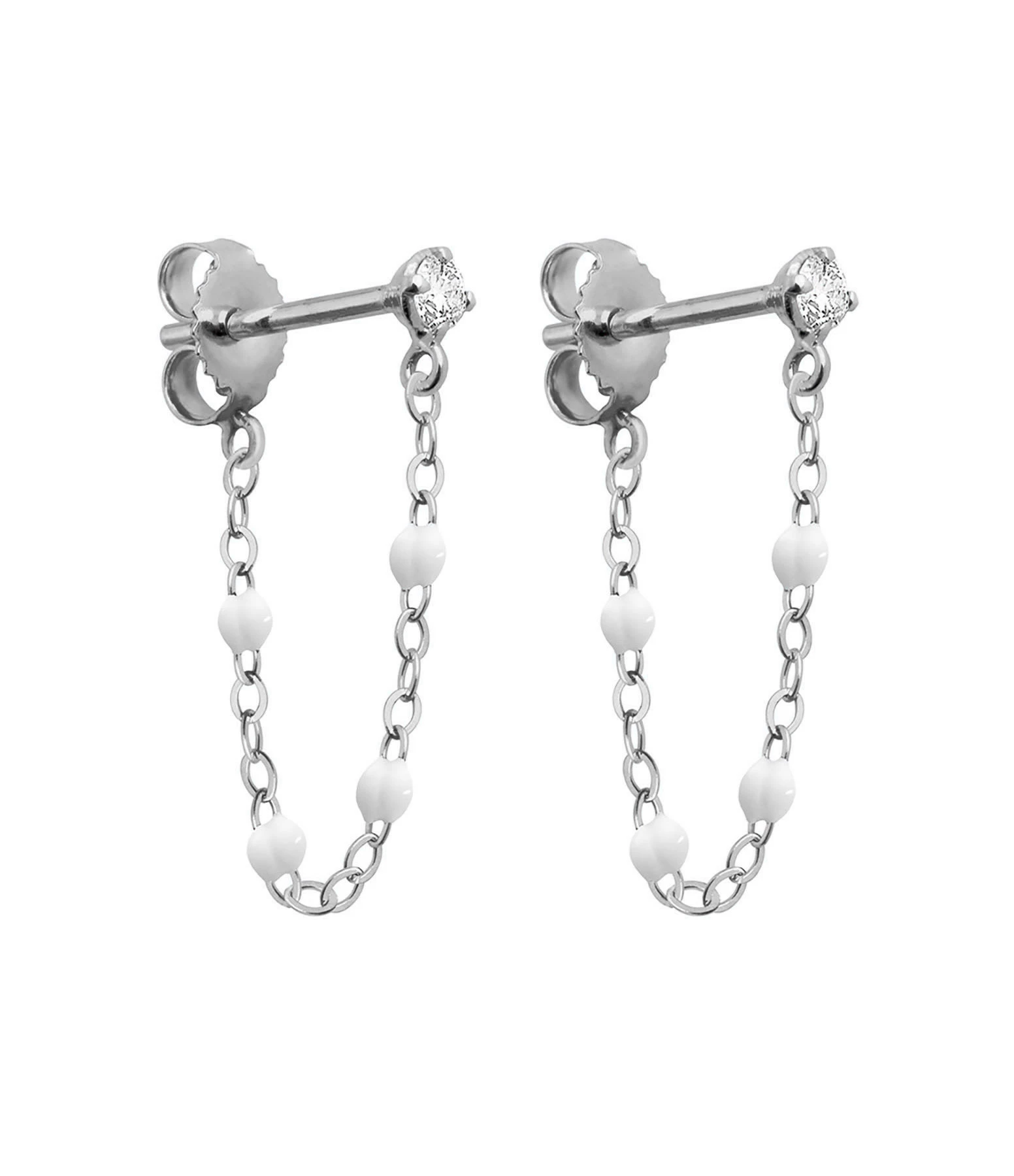 Boucles d’oreilles dormeuses en or blanc agrémentées de perles de résine et d’un diamant. Vendues à la paire.