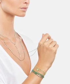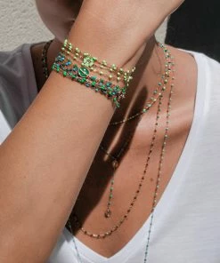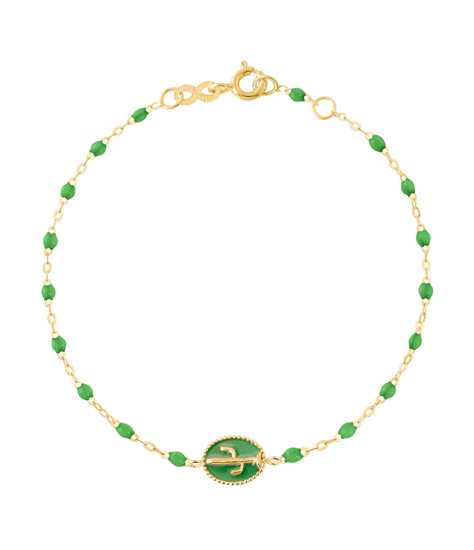 Bracelet sur chaîne en or jaune agrémenté de perles de résine vert prairie et d’une médaille avec un cactus. Fermoir classique à ressort avec contre-anneau.