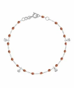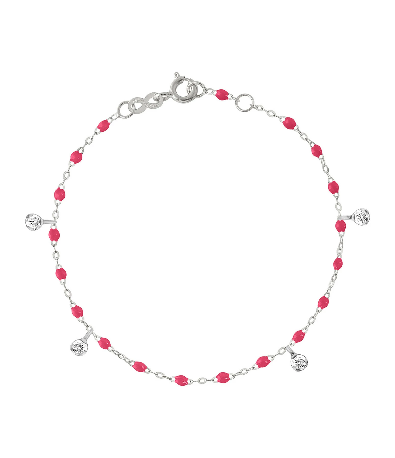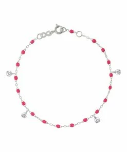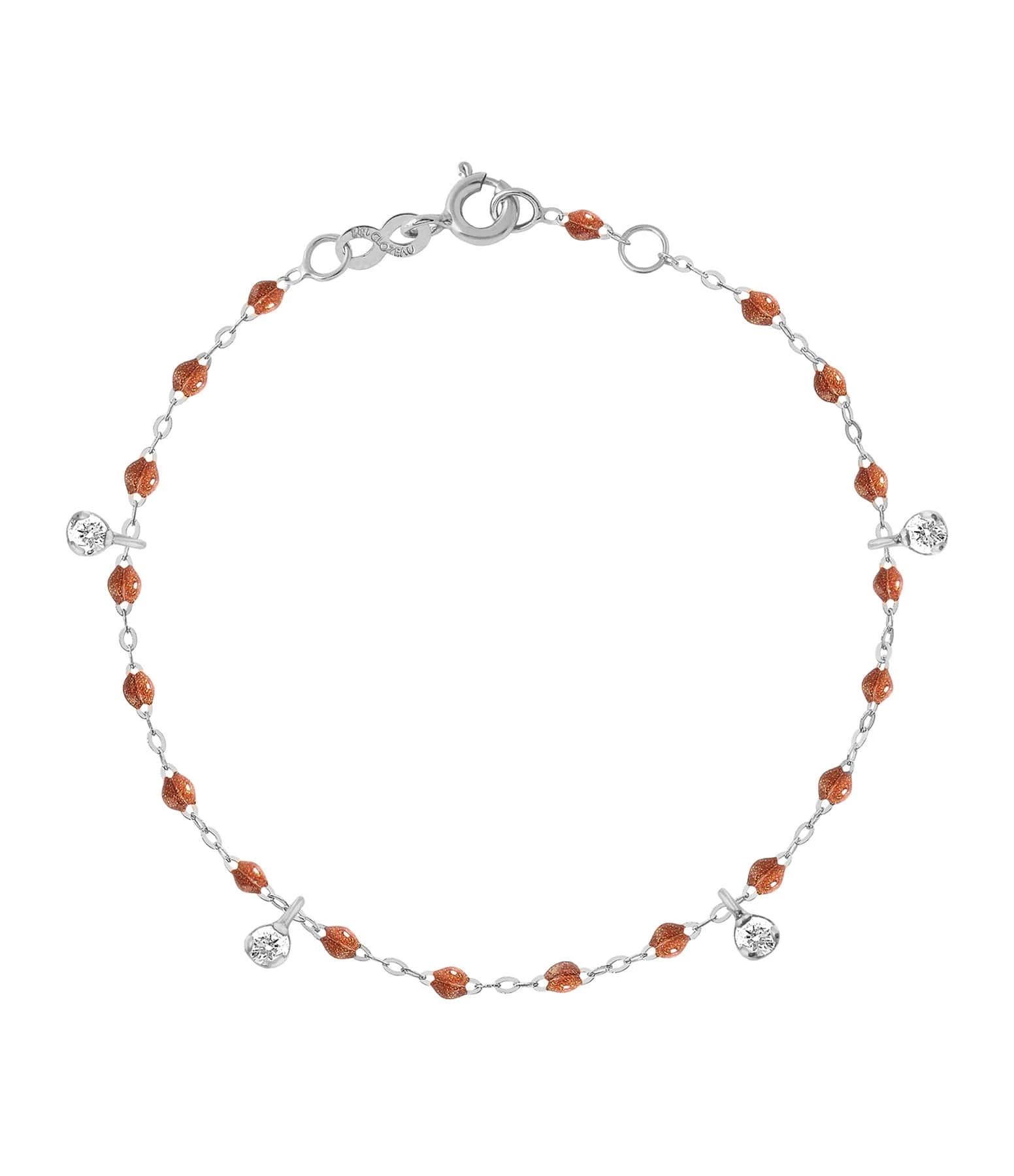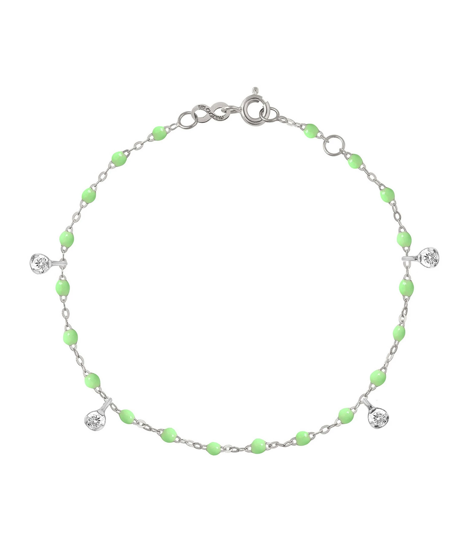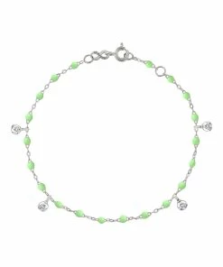Bracelet sur chaîne en or gris agrémenté de perles de résine et de quatre diamants en pendentif. Fermoir classique à ressort avec contre-anneau.