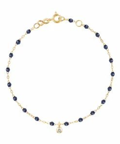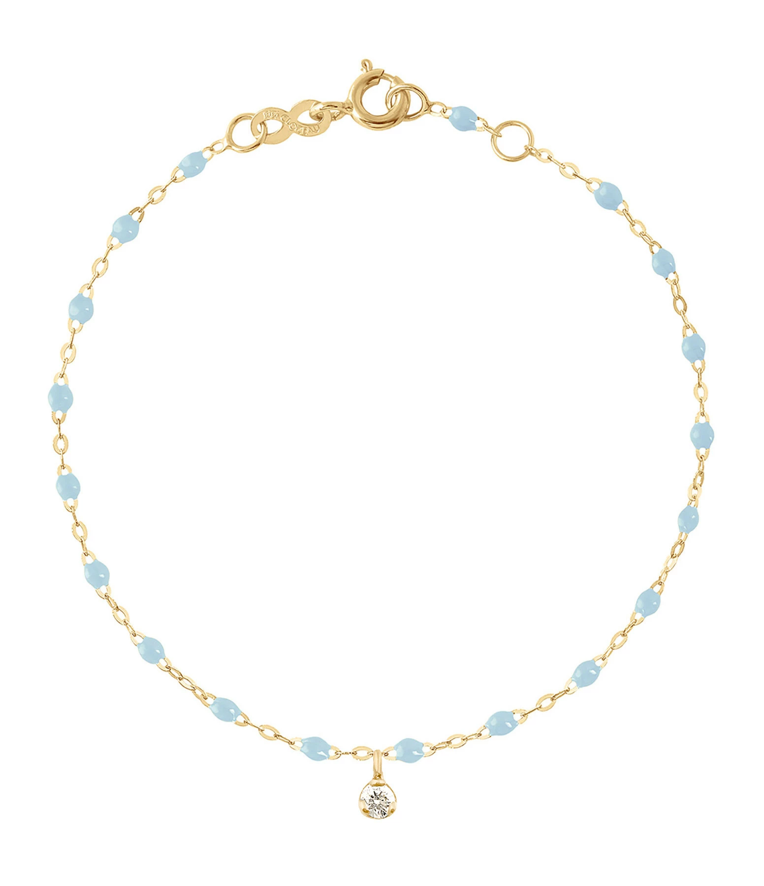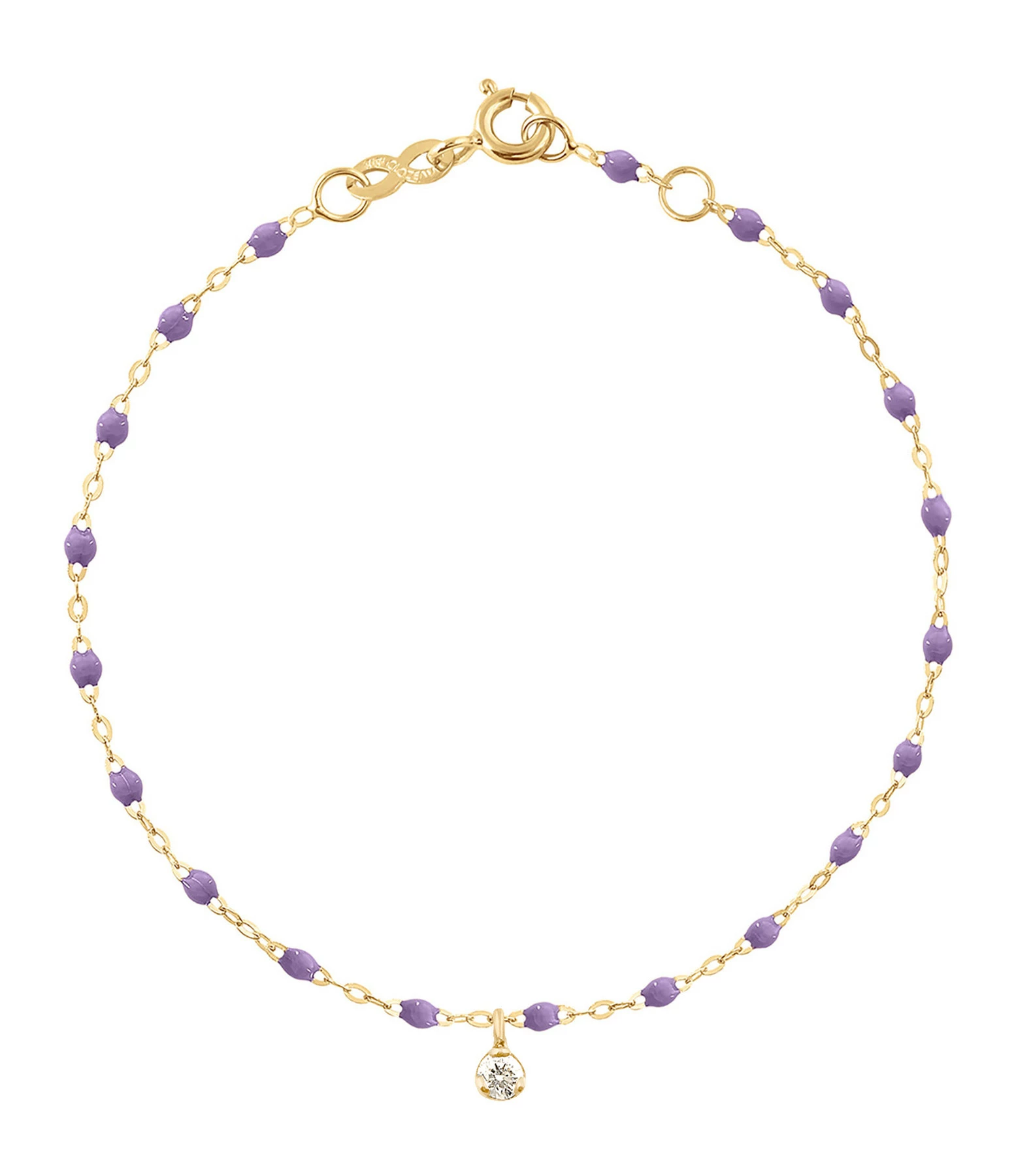 Bracelet sur chaîne en or jaune agrémenté de perles de résine et d’un diamant en pendentif. Fermoir classique à ressort avec contre-anneau.