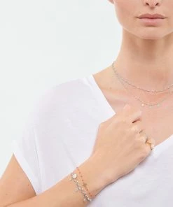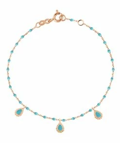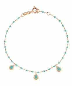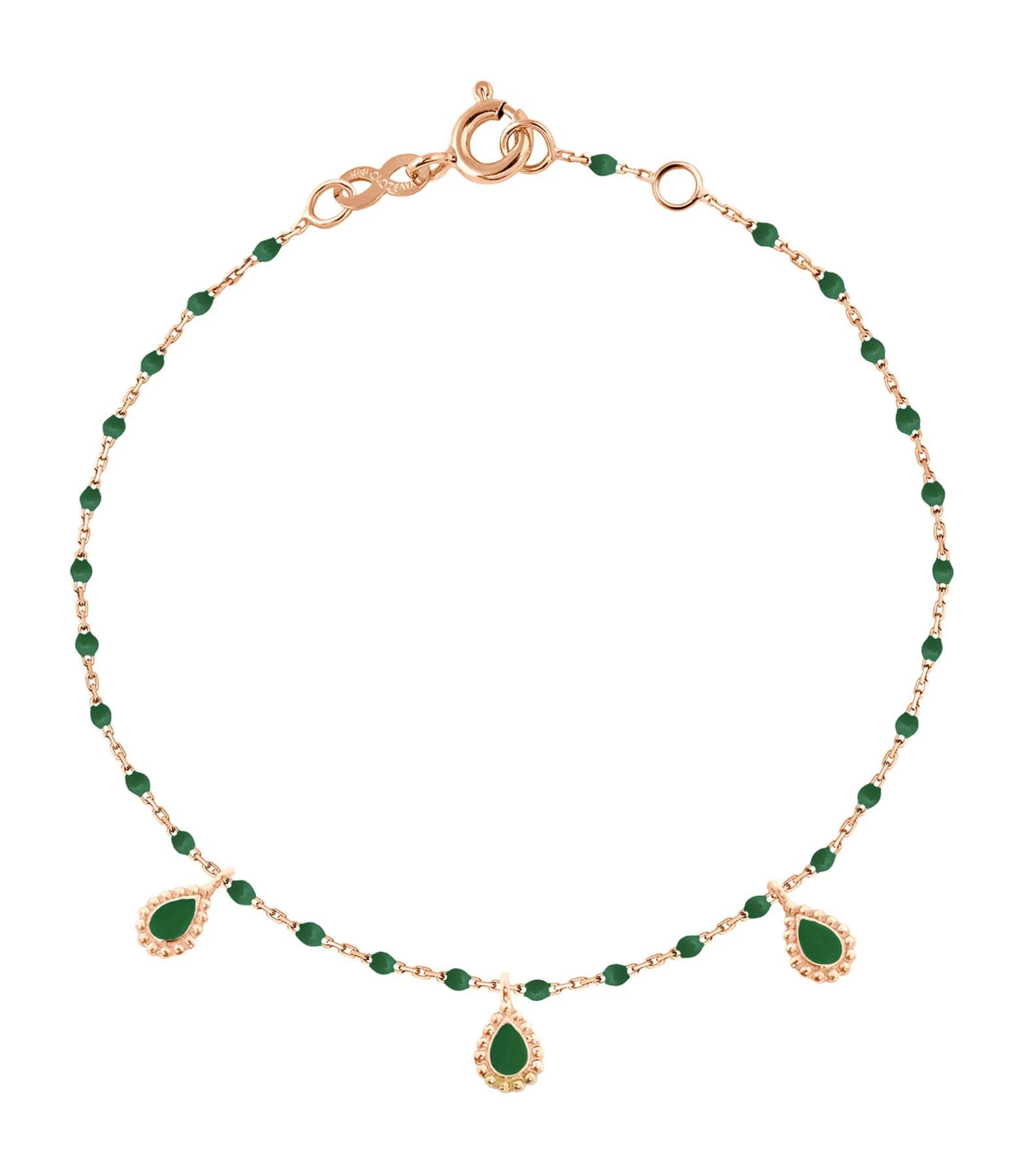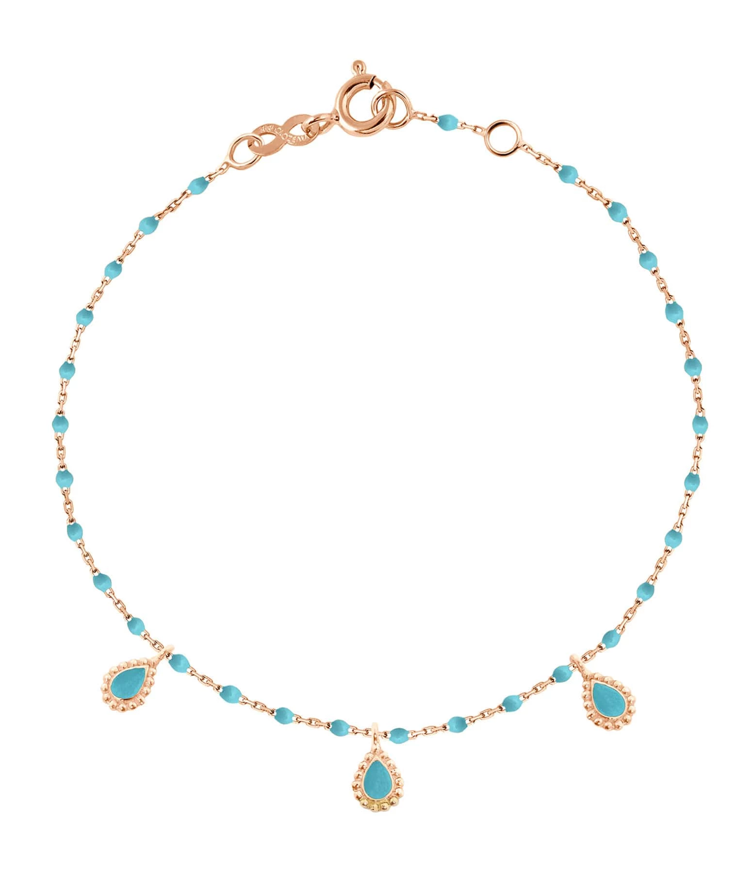 Bracelet sur chaîne en or rose, agrémenté de trois pendentifs et de mini perles de résine. Fermoir classique à ressort avec contre-anneau.