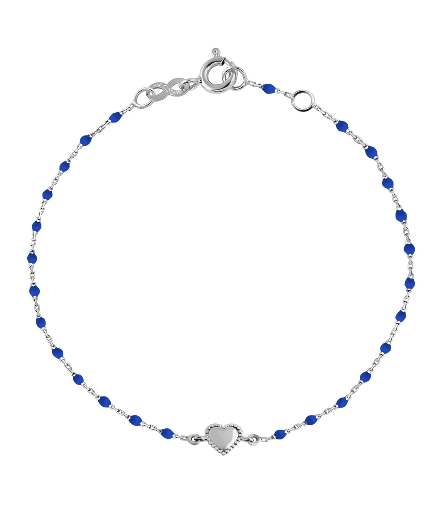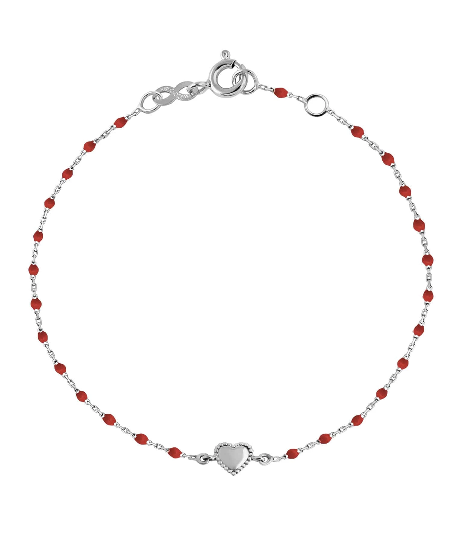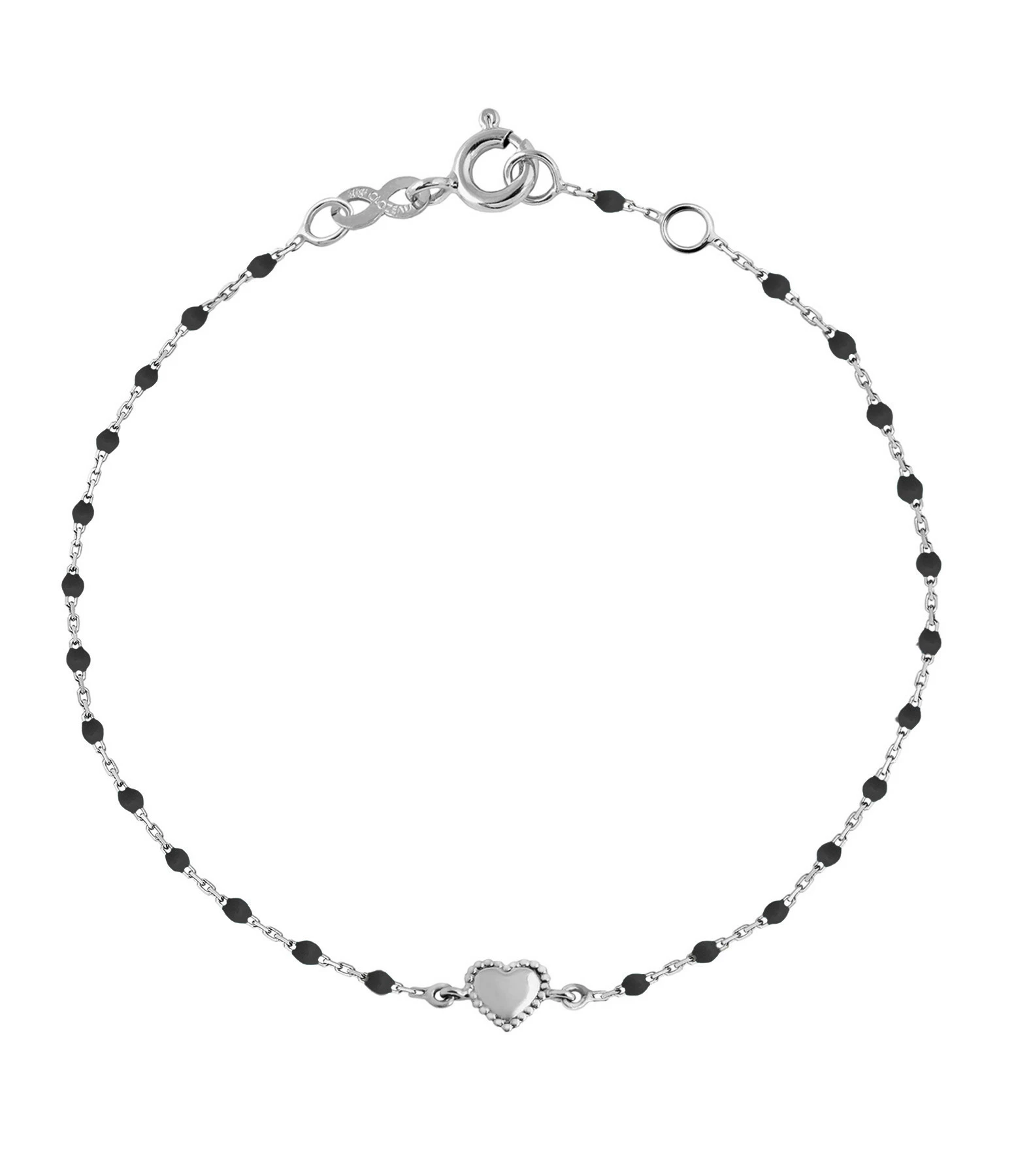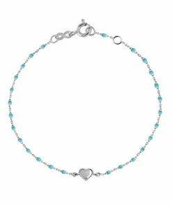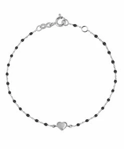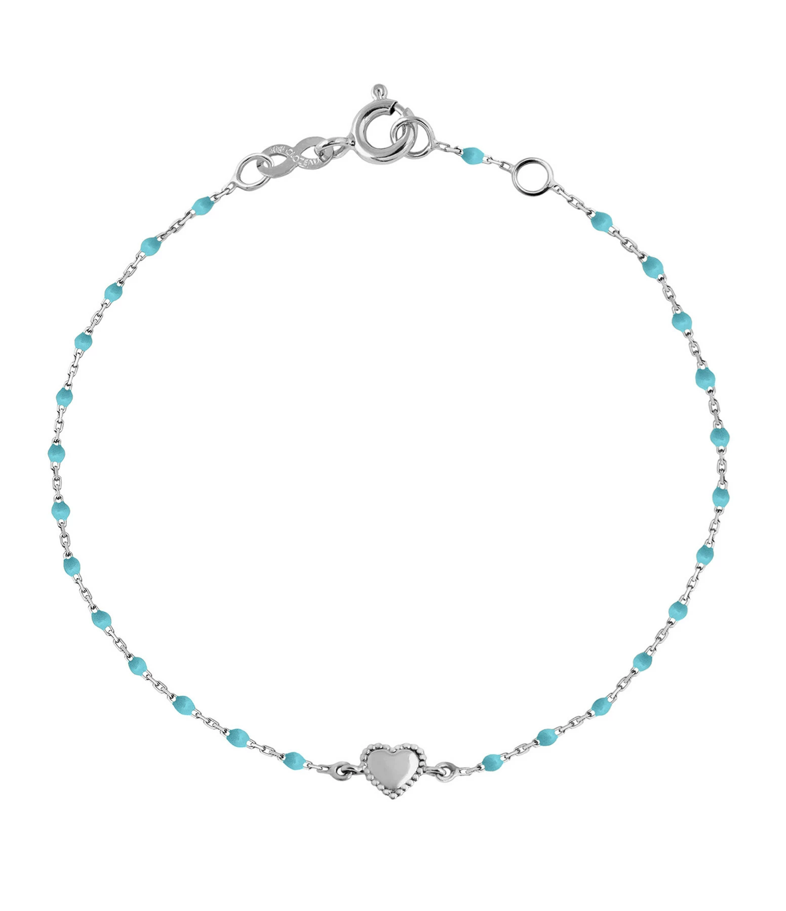 Bracelet sur chaîne en or gris agrémenté de mini perles de résine et d’un petit cœur. Fermoir classique à ressort avec contre-anneau.