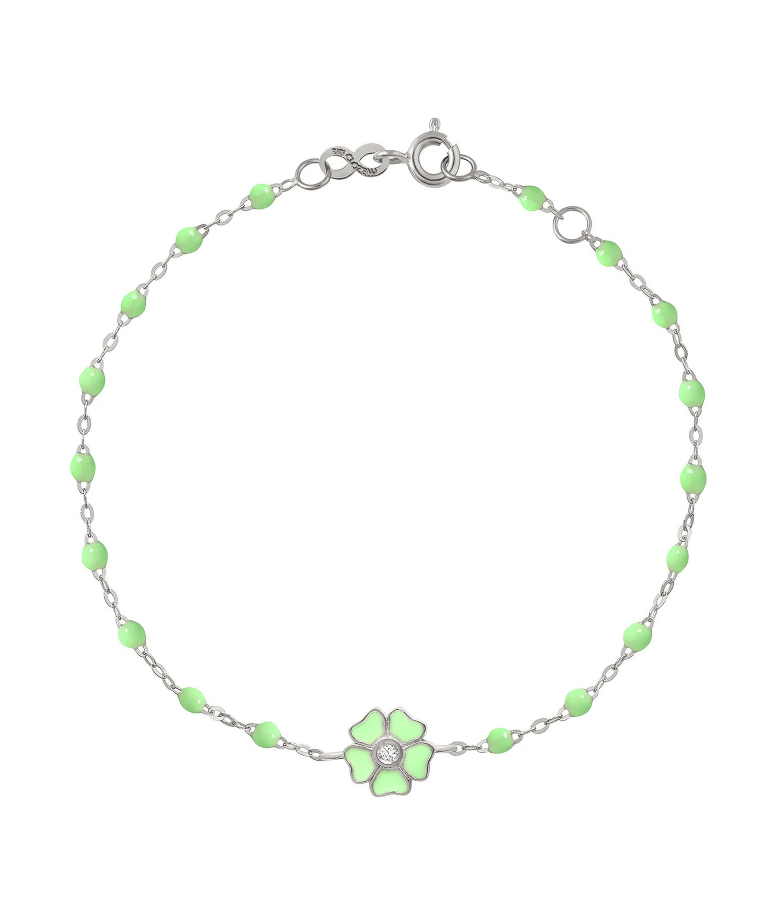 Bracelet sur chaîne en or blanc agrémenté de mini perles de résine et d’une petite fleur. Fermoir classique à ressort avec contre-anneau.