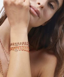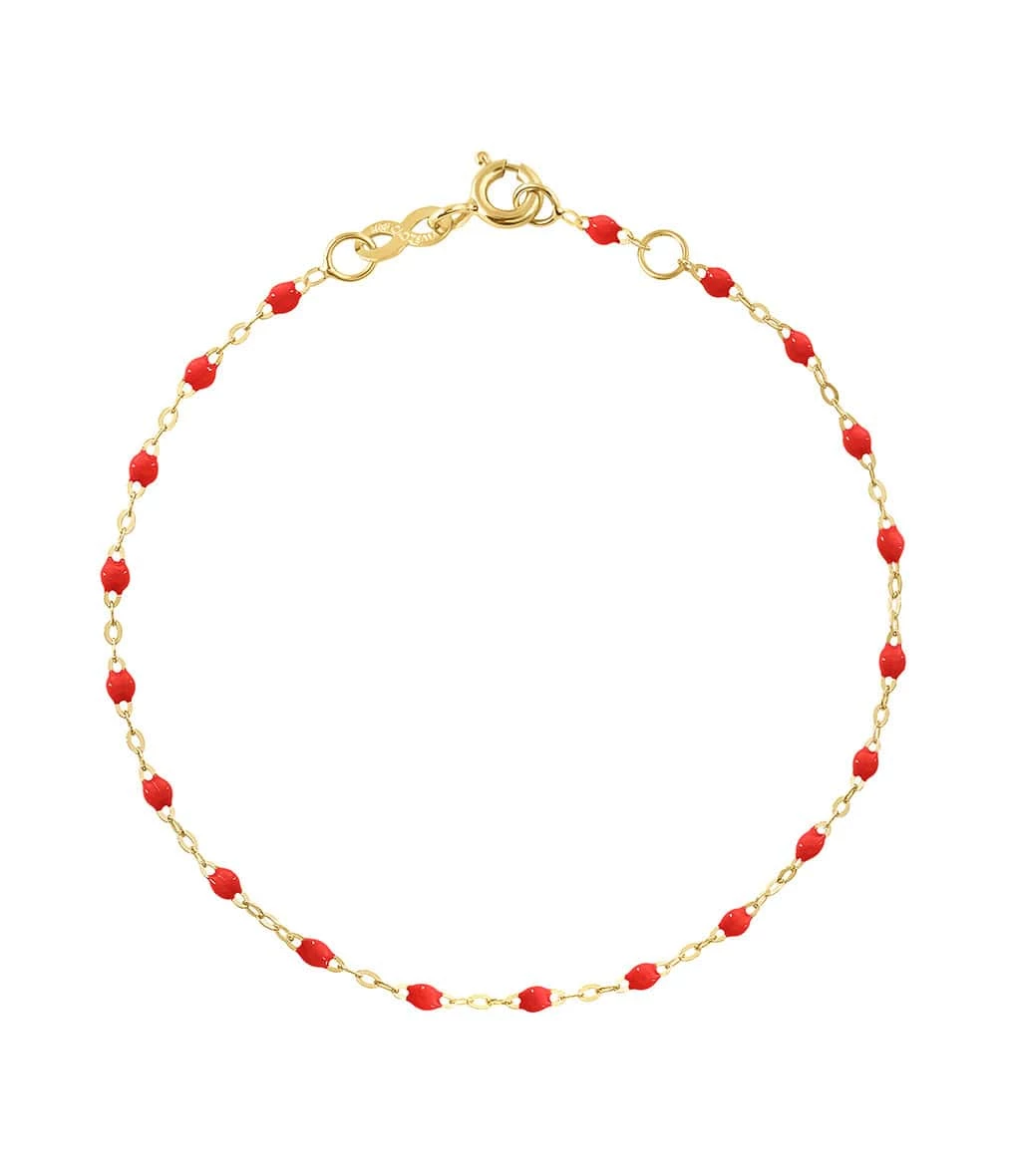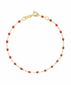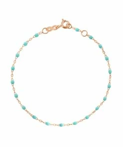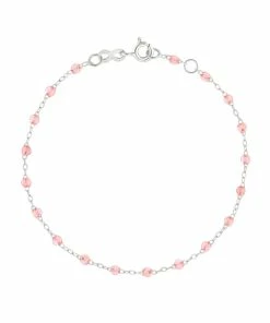 Bracelet sur chaîne en or gris, jaune ou rose agrémenté de perles de résine. Fermoir classique à ressort avec contre-anneau.