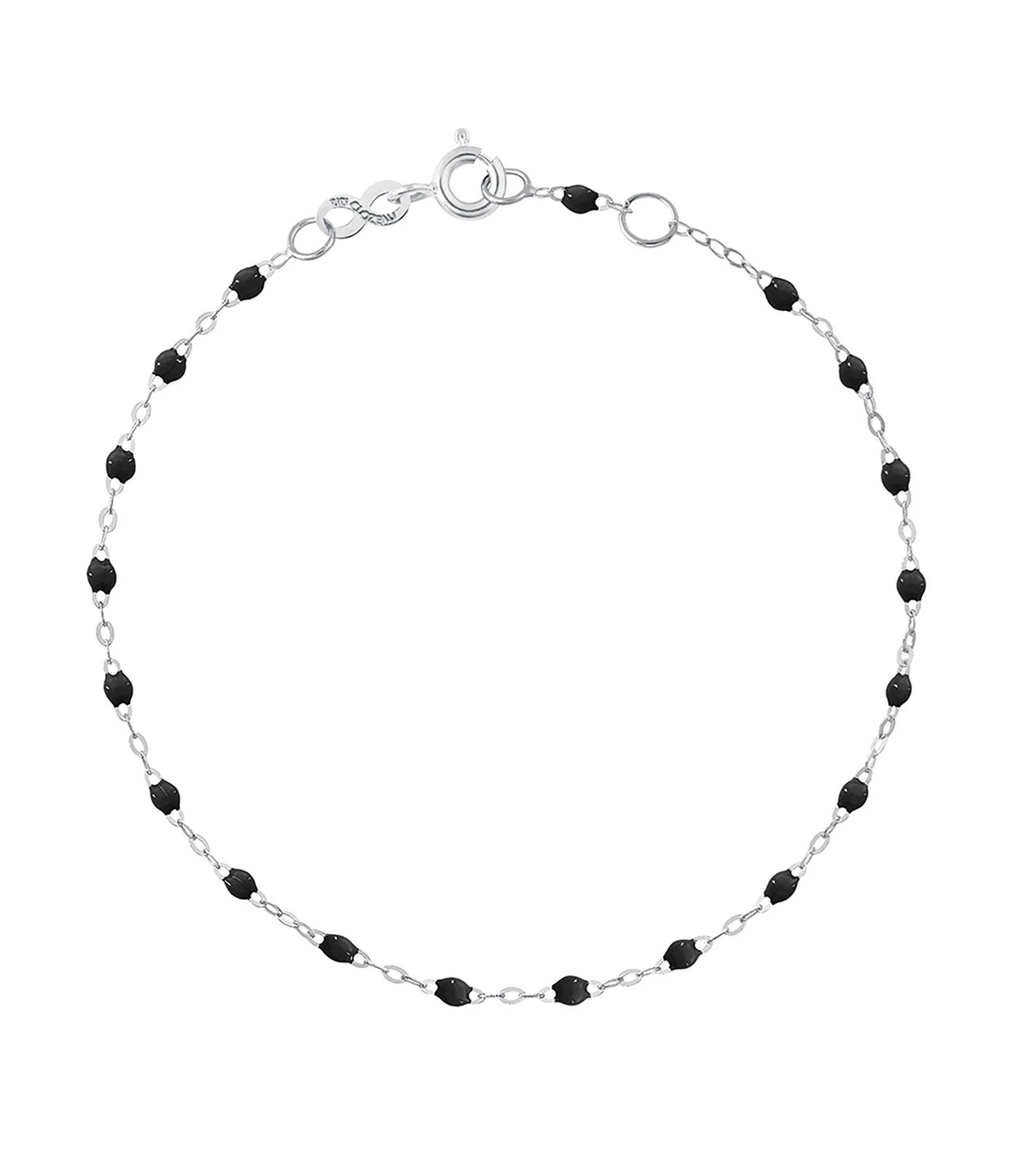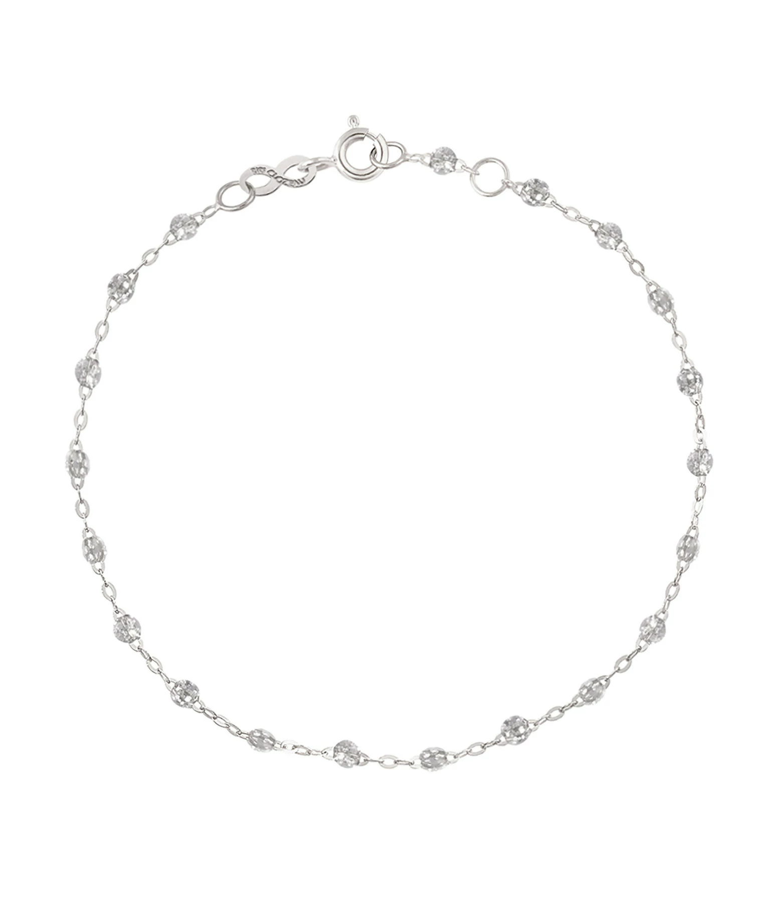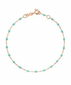 Bracelet sur chaîne en or gris, jaune ou rose agrémenté de perles de résine. Fermoir classique à ressort avec contre-anneau.