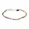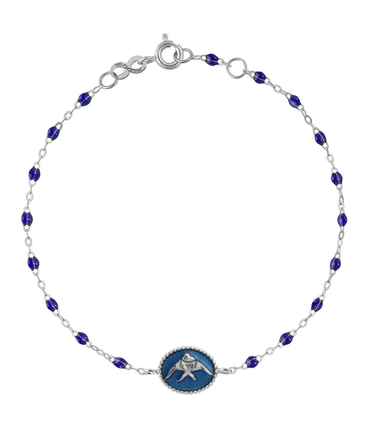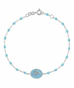 Bracelet sur chaîne en or blanc agrémenté de perles de résine colorée et d’une médaille avec un poisson. Fermoir classique à ressort avec contre-anneau.