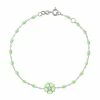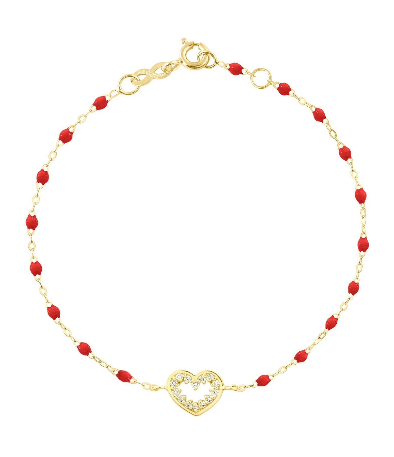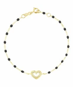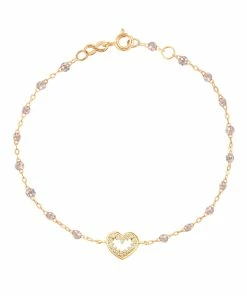 Bracelet sur chaîne en or jaune agrémenté de perles de résine et d’un pendentif en forme de cœur serti de diamants. Fermoir classique à ressort avec contre-anneau.