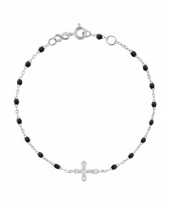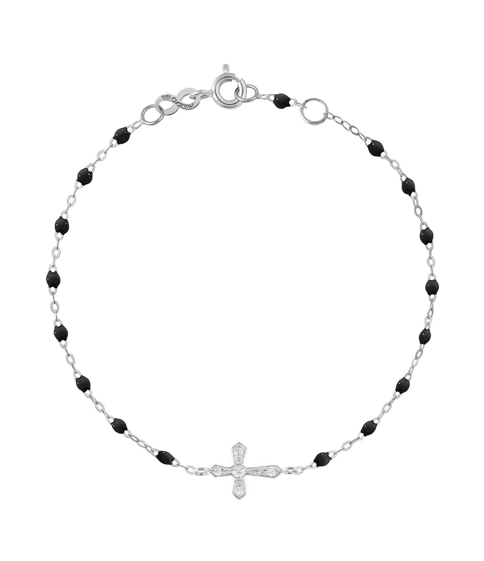 Bracelet sur chaîne en or blanc agrémenté de perles de résine et d’un pendentif en forme de croix serti de diamants. Fermoir classique à ressort avec contre-anneau.