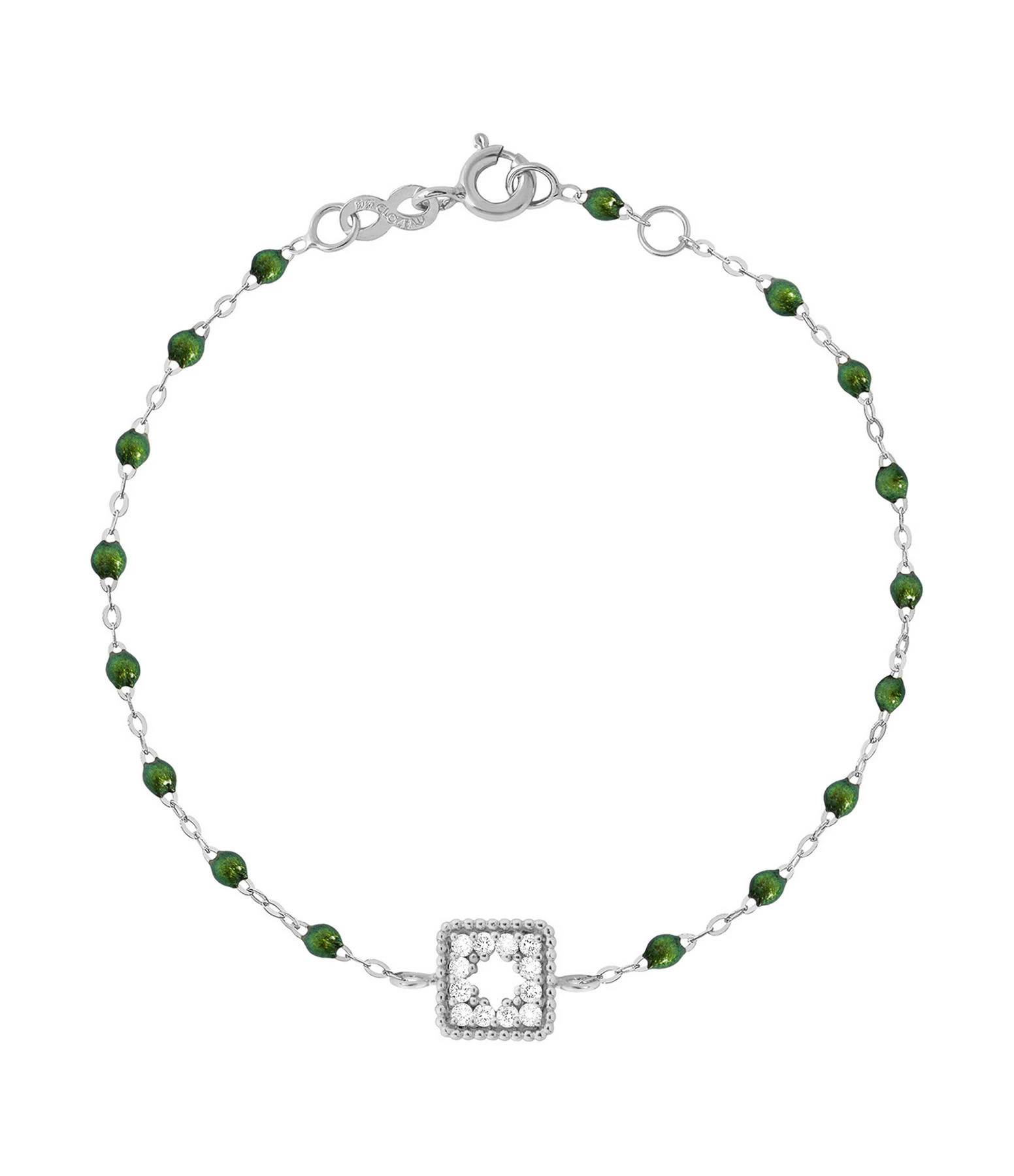 Bracelet sur chaîne en or blanc agrémenté de perles de résine et d’un pendentif carré. Fermoir classique à ressort avec contre-anneau.
