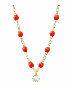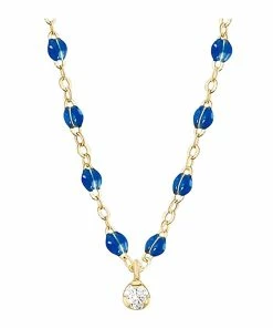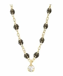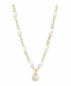 Collier sur chaîne en or jaune agrémenté d’un diamant et de perles de résine. Fermoir classique à ressort avec contre-anneau.