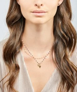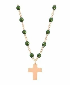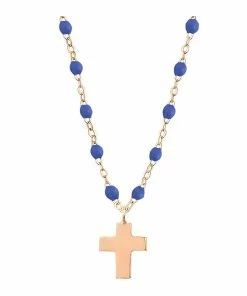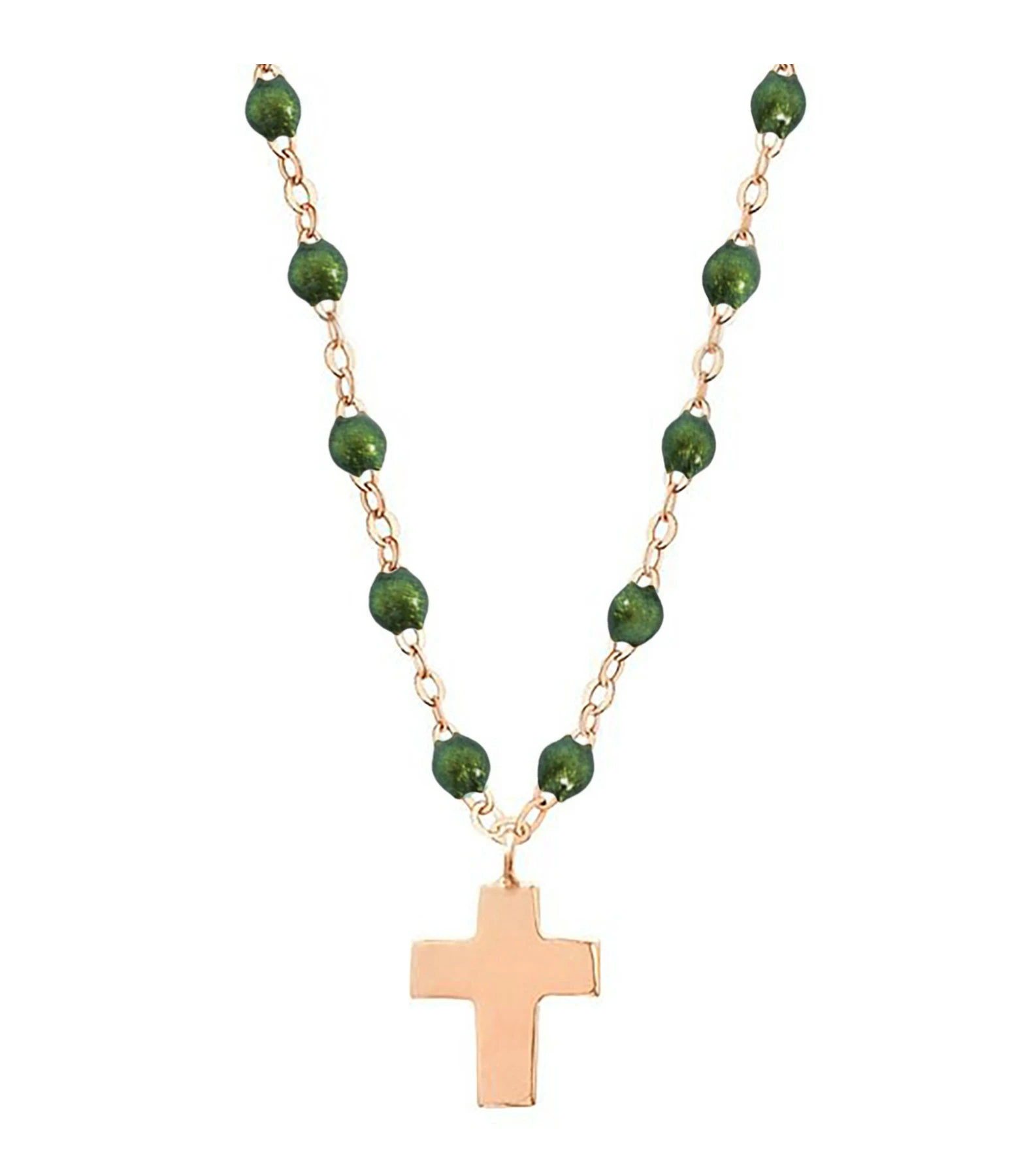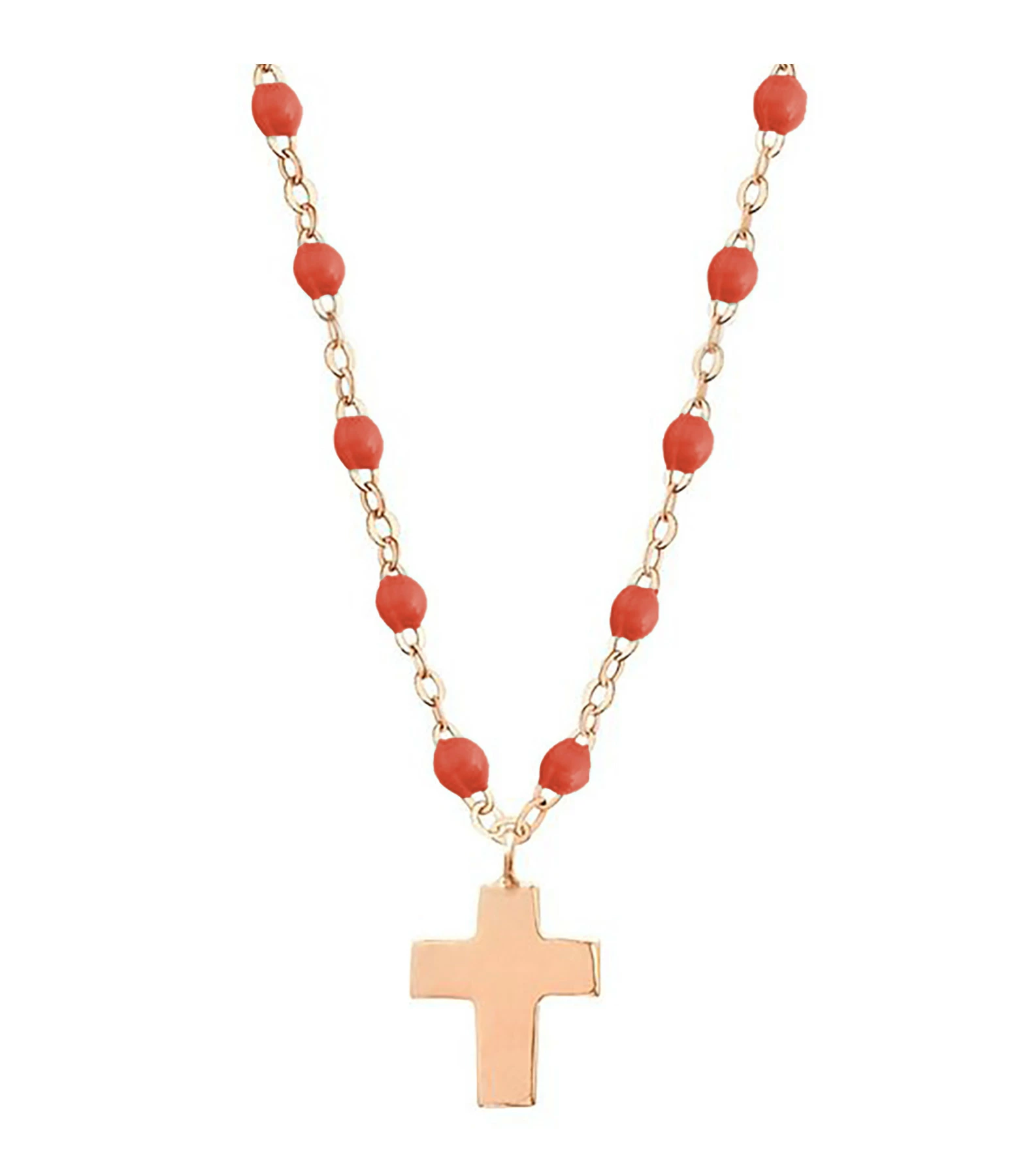 Collier sur chaîne en or gris, jaune ou rose agrémenté d’un pendentif Croix et de perles de résine. Fermoir classique à ressort avec contre-anneau.La fabrication de ce modèle est limitée aux 27 couleurs de résine présentées.