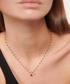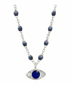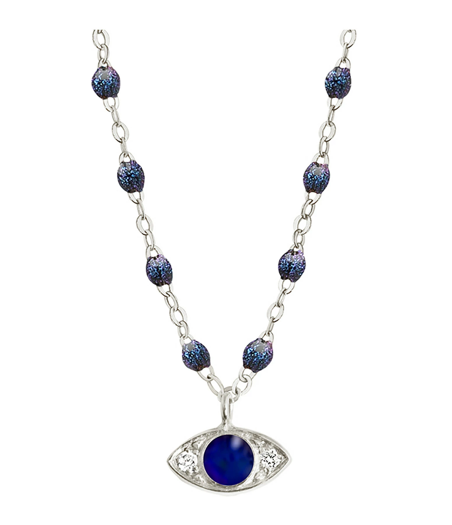 Collier sur chaîne en or blanc agrémenté de perles de résine et d’une médaille œil sertie de deux diamants. Fermoir classique à ressort avec contre-anneau.