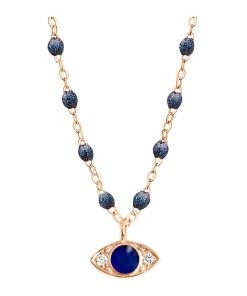 Collier sur chaîne en or rose agrémenté de perles de résine et d’une médaille œil sertie de deux diamants. Fermoir classique à ressort avec contre-anneau.