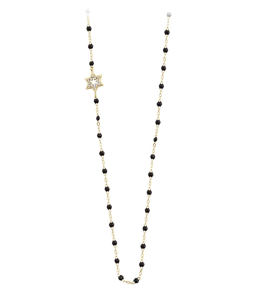 Collier sur chaîne en or agrémenté d’une Étoile de David sertie de diamant blanc et de perles de résine. Fermoir classique à ressort avec contre-anneau.