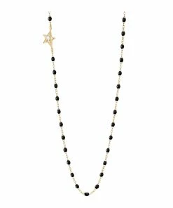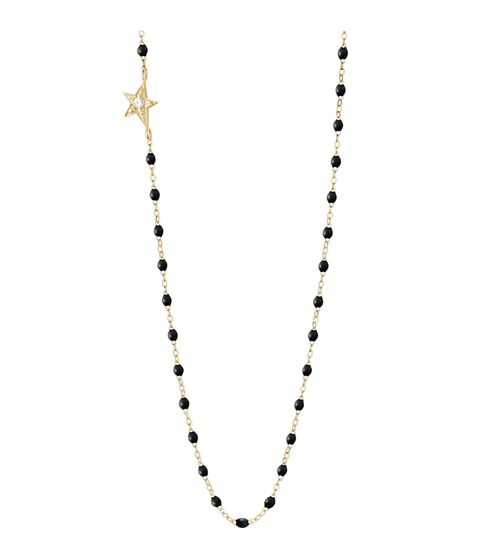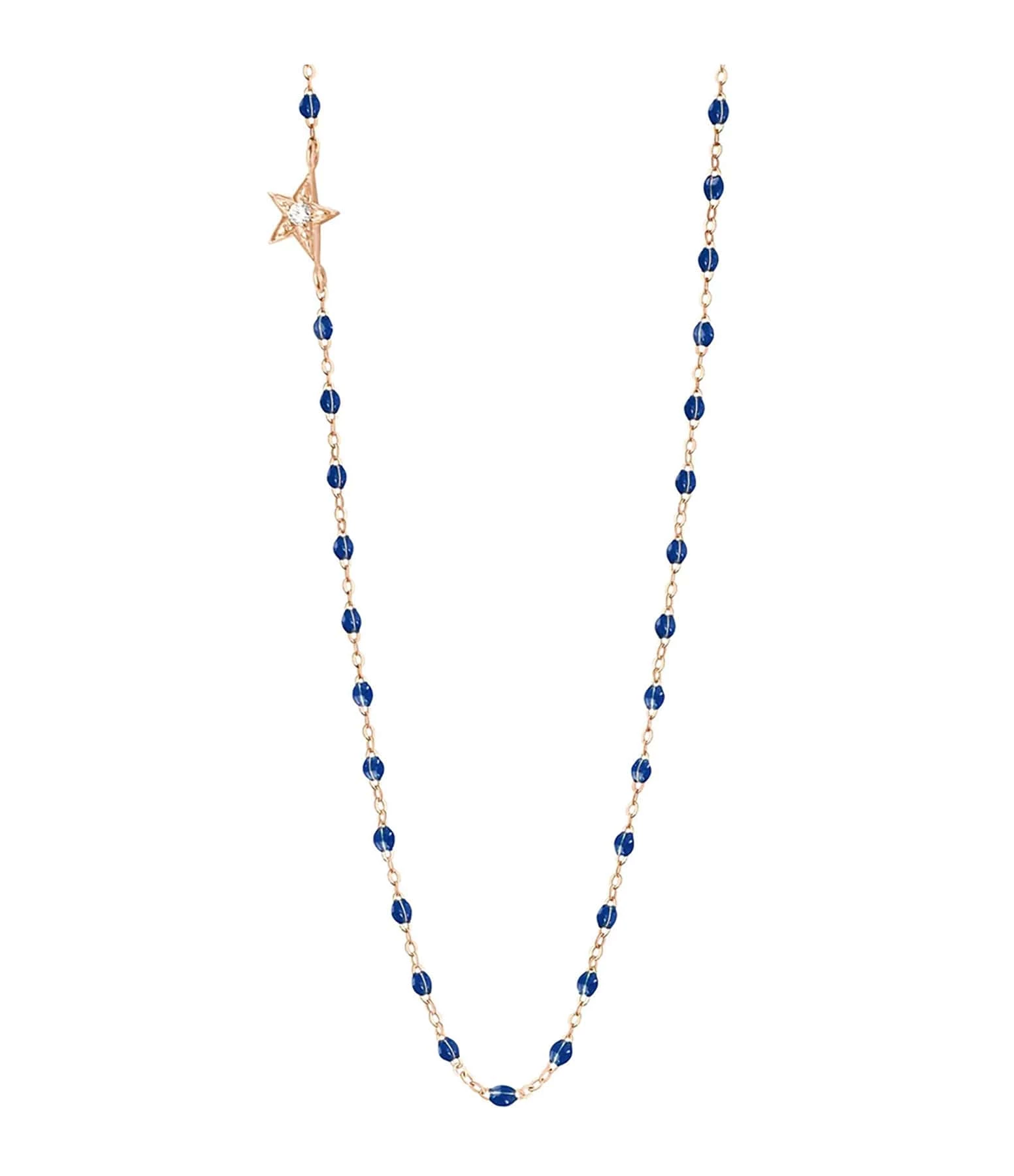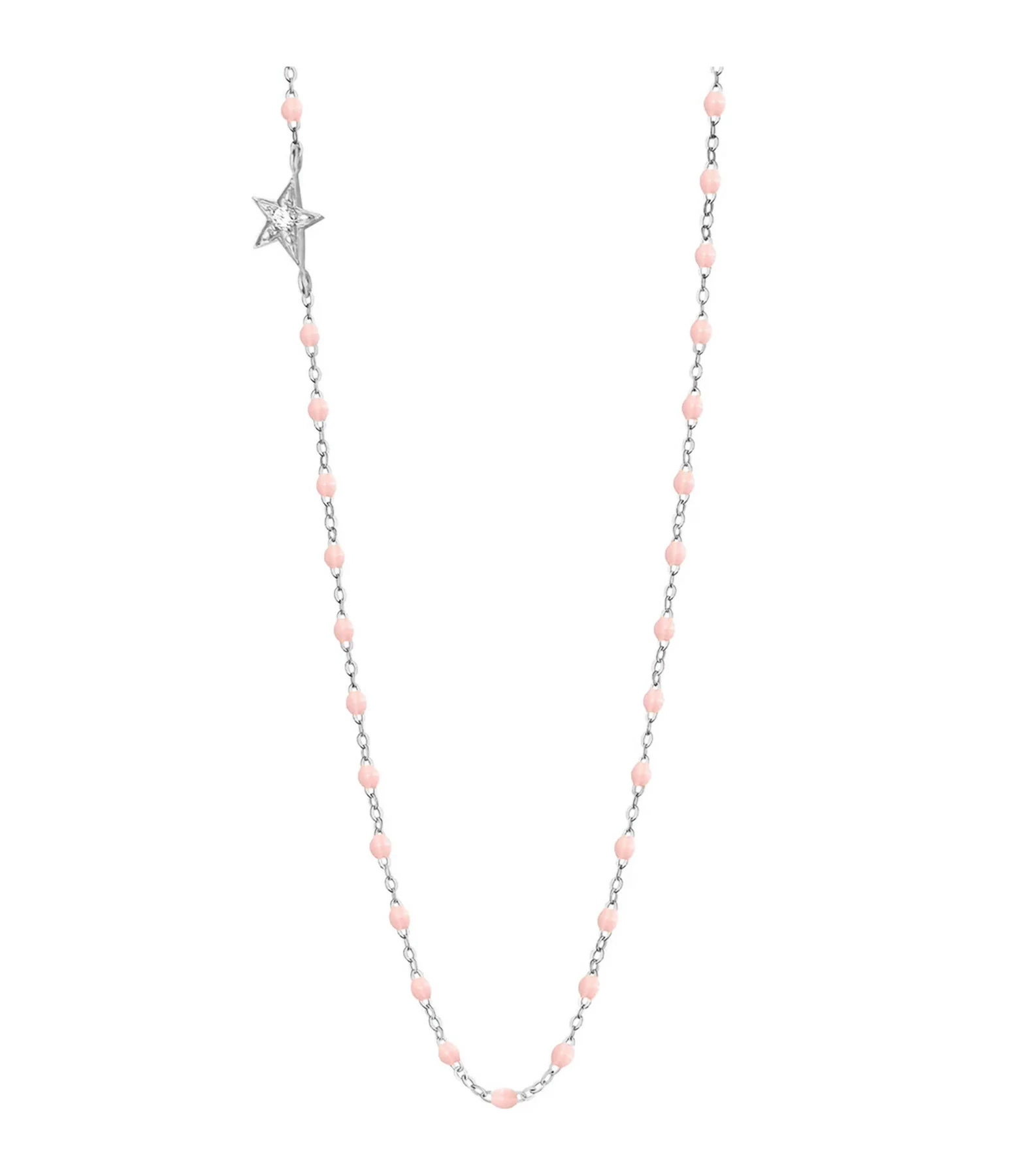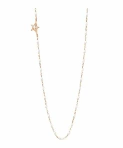 Collier sur chaîne en or gris, jaune ou rose agrémenté d’une Étoile sertie d’un diamant blanc et de perles de résine. Fermoir classique à ressort avec contre-anneau.
