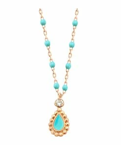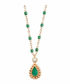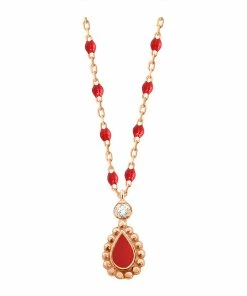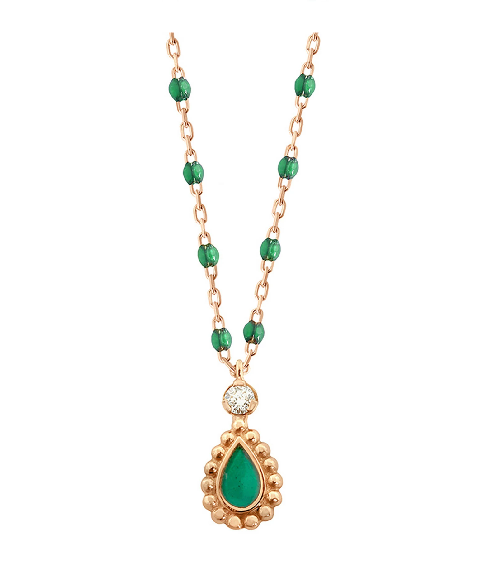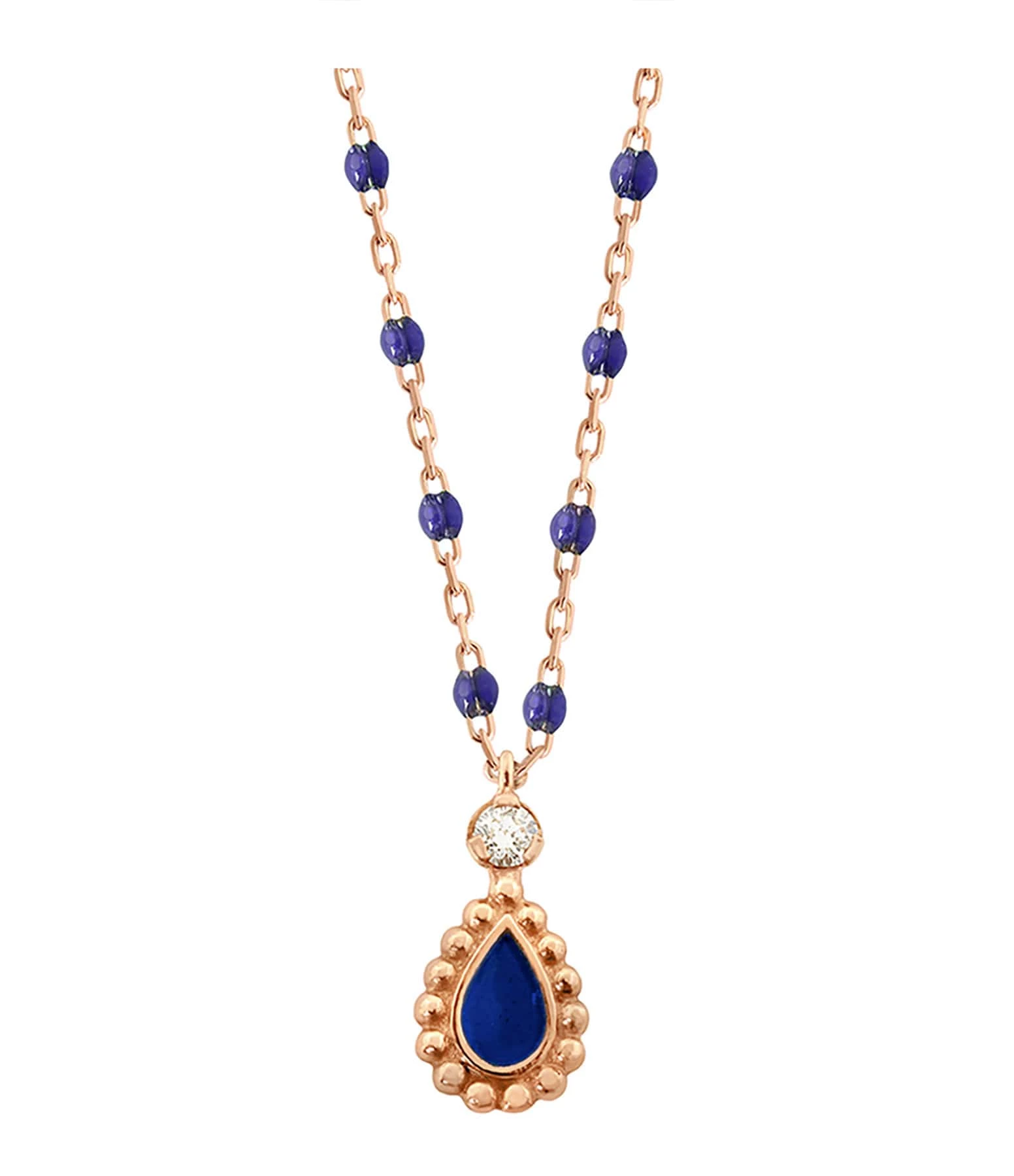 Collier sur chaîne en or rose agrémenté de perles de résine et d’un pendentif en or rose 18 carats émaillé du même coloris et d’un diamant. Fermoir classique à ressort avec contre-anneau.