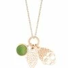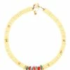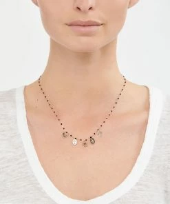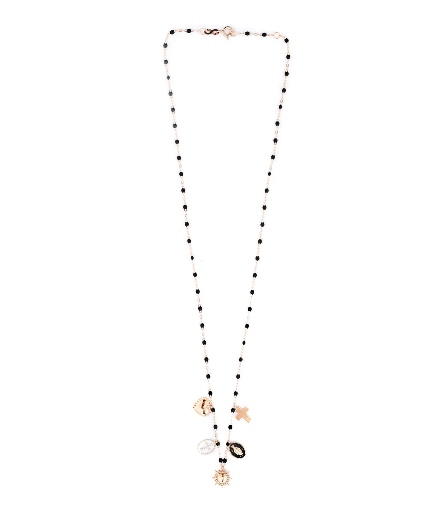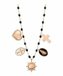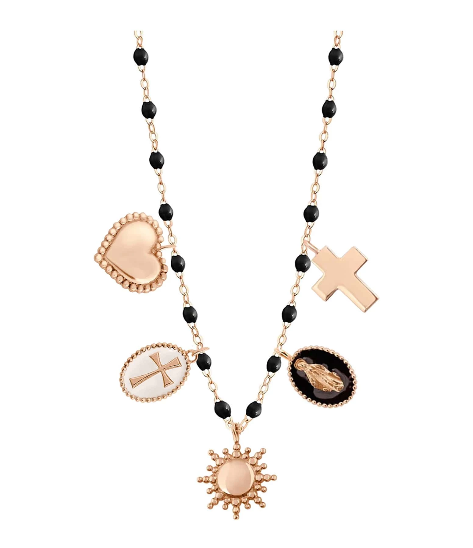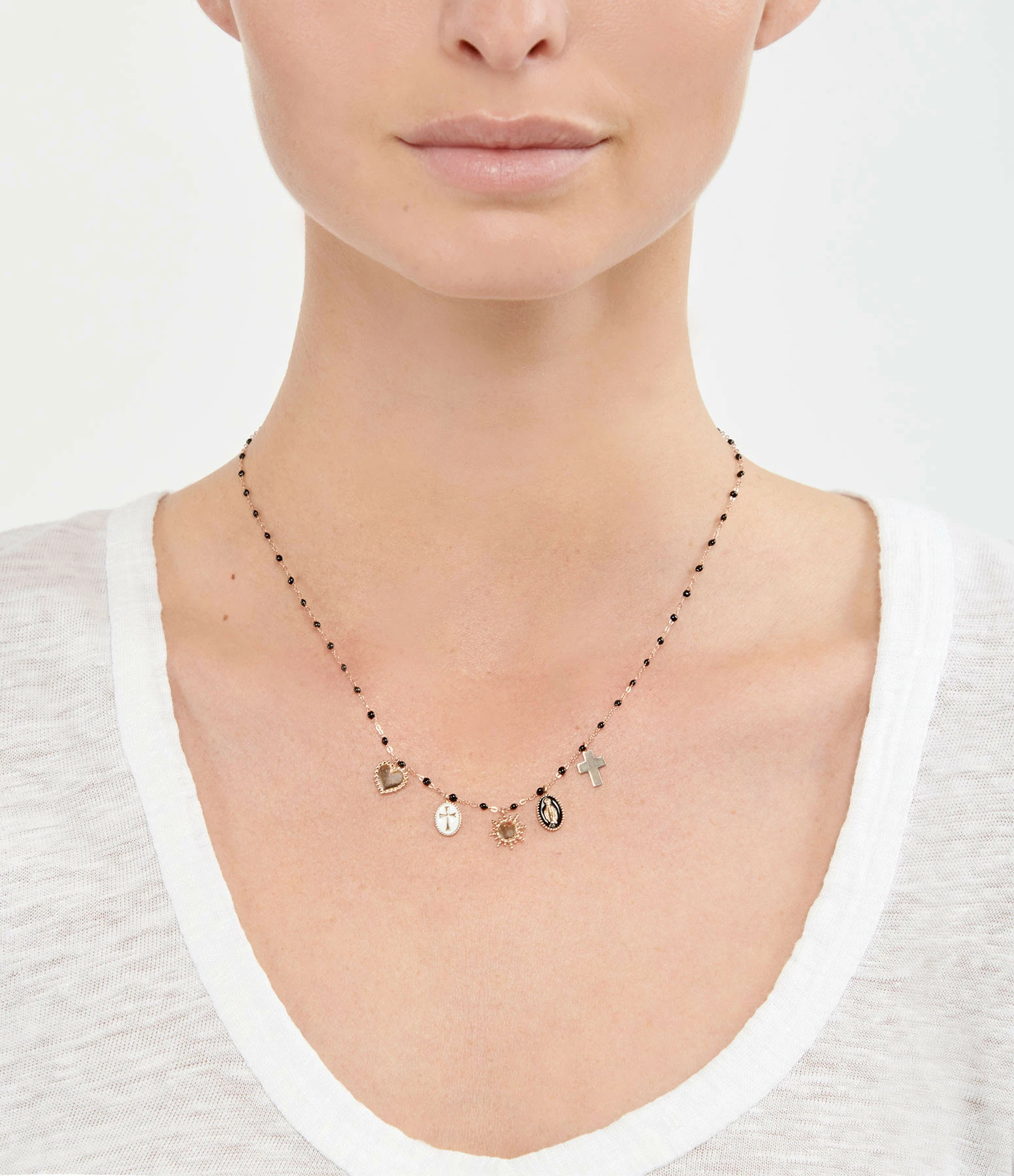 Collier sur chaîne en or rose agrémenté de cinq pendentifs et de perles de résine. Deux pendentifs Croix, un pendentif Madone, un pendentif Soleil et un pendentif Cœur. Fermoir classique à ressort avec contre-anneau.