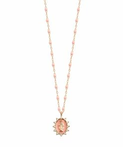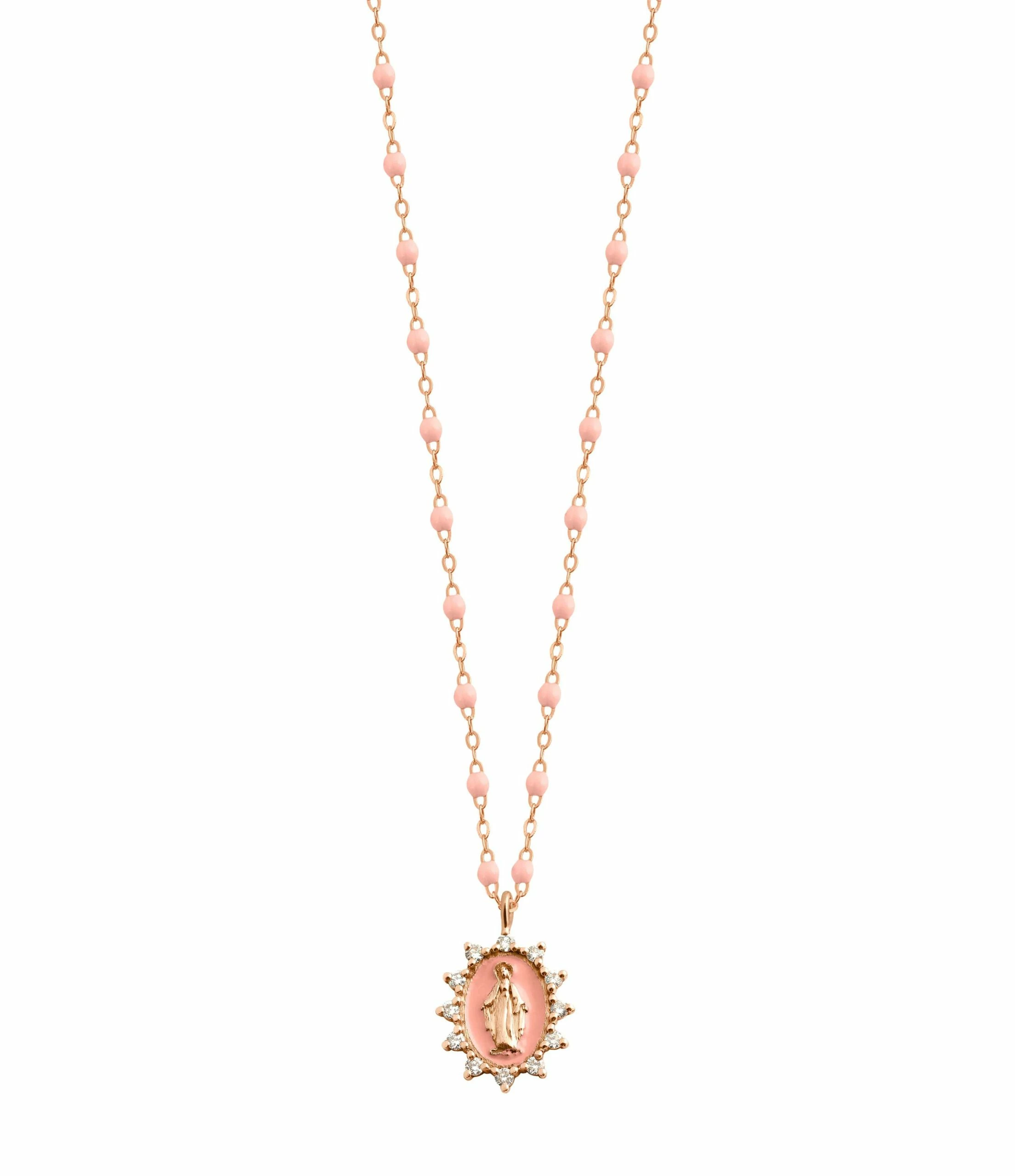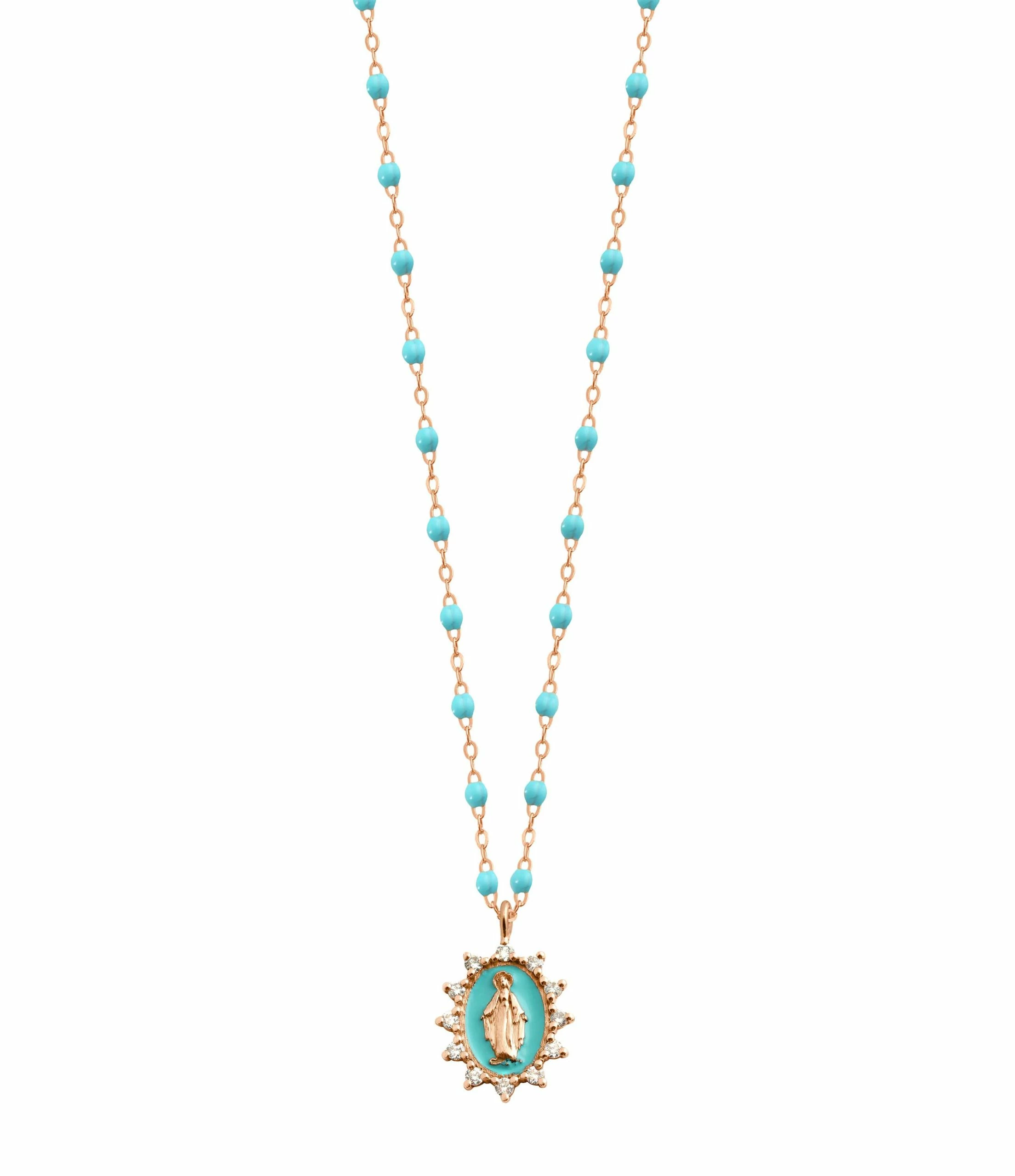 Collier sur chaîne en or gris, jaune ou rose agrémenté d’une médaille Madone Suprême sertie de 12 diamants blancs et de perles de résine. Fermoir classique à ressort avec contre-anneau.