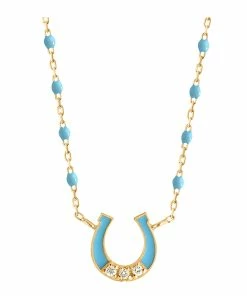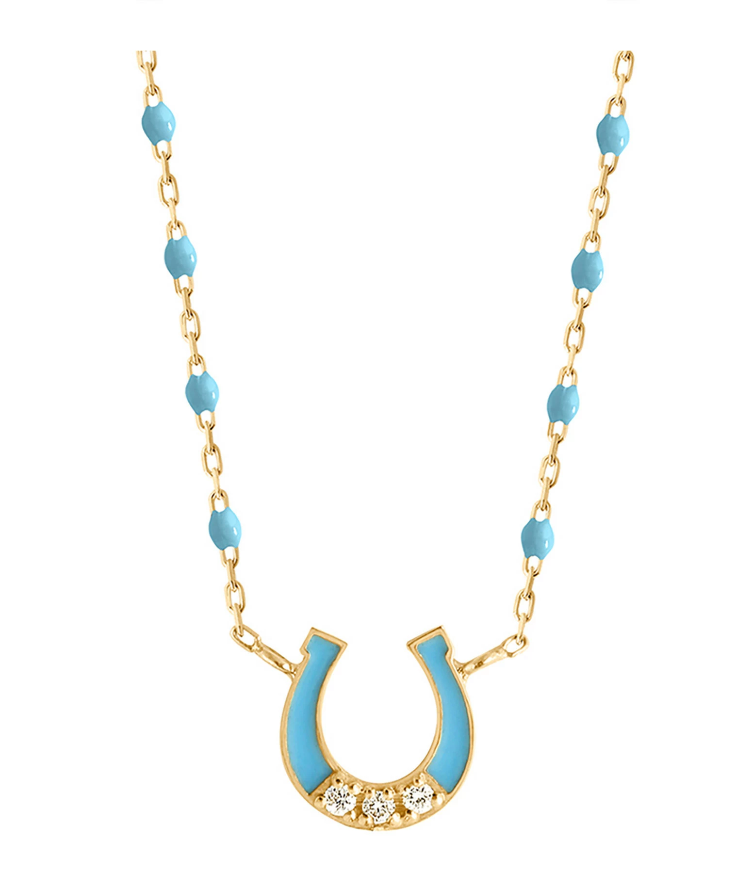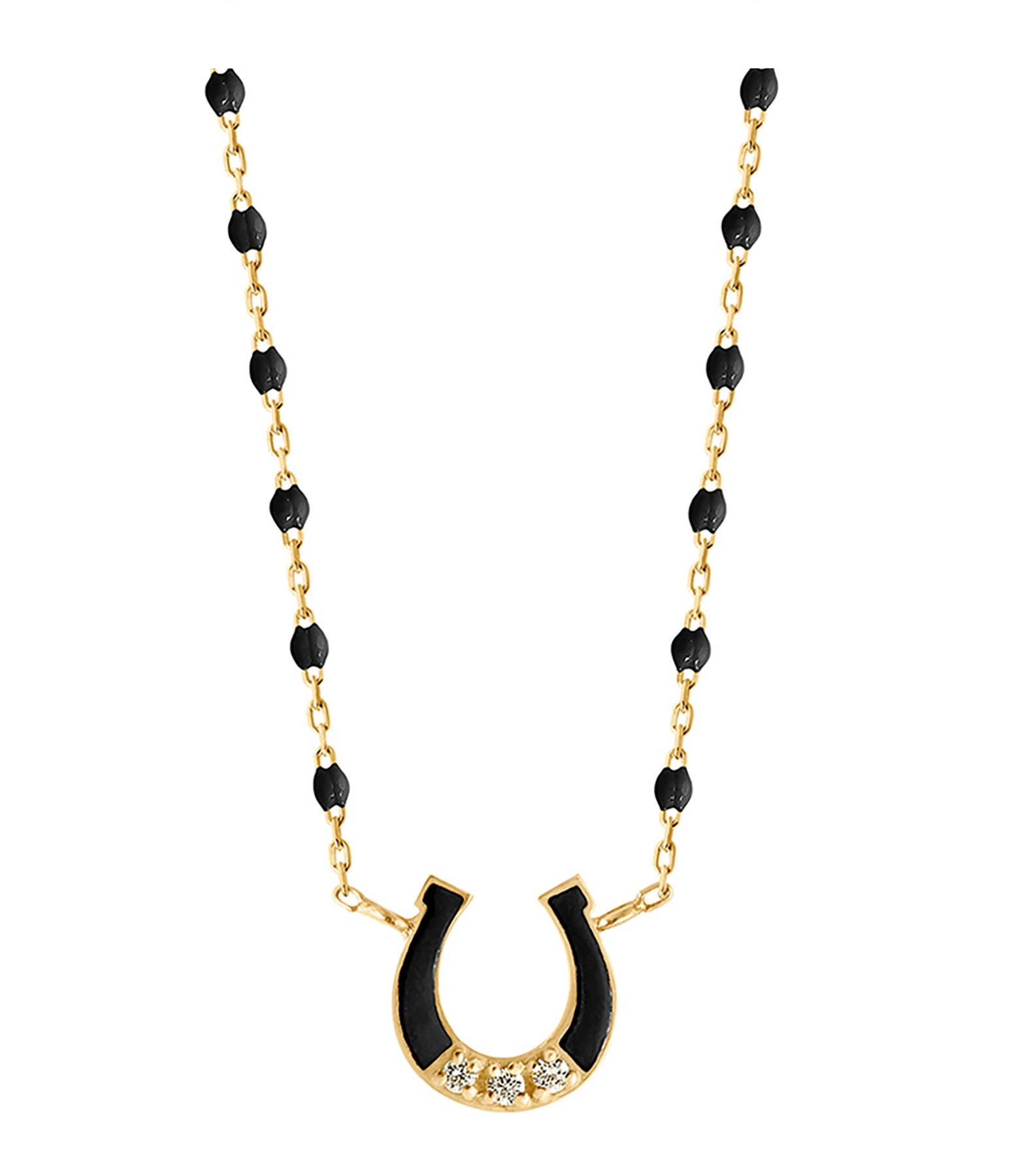 Collier sur chaîne en or jaune agrémenté de perles de résine et d’un pendentif fer à cheval en or jaune 18 carats serti de 3 diamants et émaillé du même coloris. Fermoir classique à ressort avec contre-anneau.