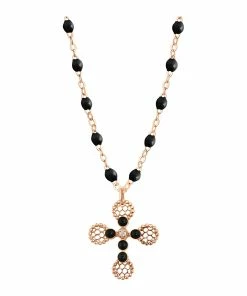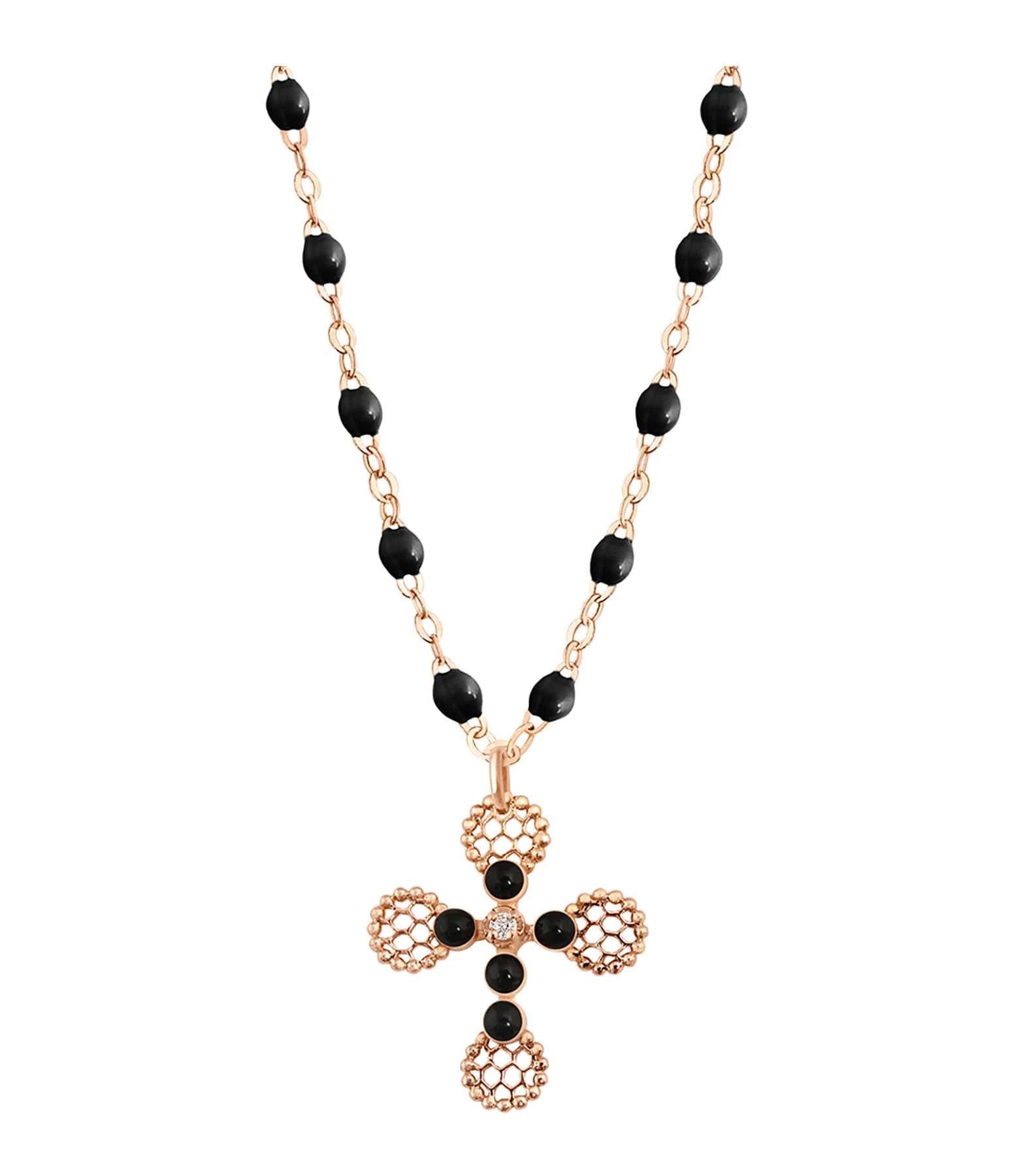 Collier sur chaîne en or rose agrémenté de perles de résine et d’un pendentif croix serti d’un diamant. Fermoir classique à ressort avec contre-anneau.