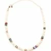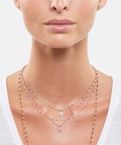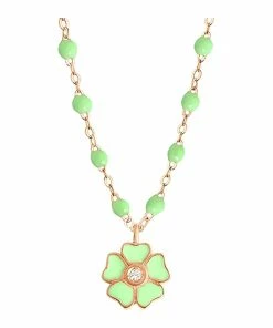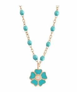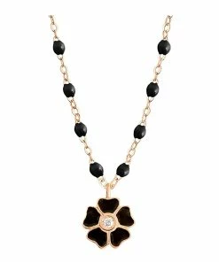Collier sur chaîne en or rose agrémenté de perles de résine, pendentif fleur serti d’un diamant blanc. Fermoir classique à ressort avec contre-anneau.