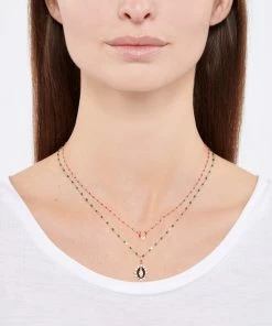 Collier sur chaîne en or gris, jaune ou rose agrémenté de perles de résine. Fermoir classique à ressort avec contre-anneau.