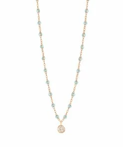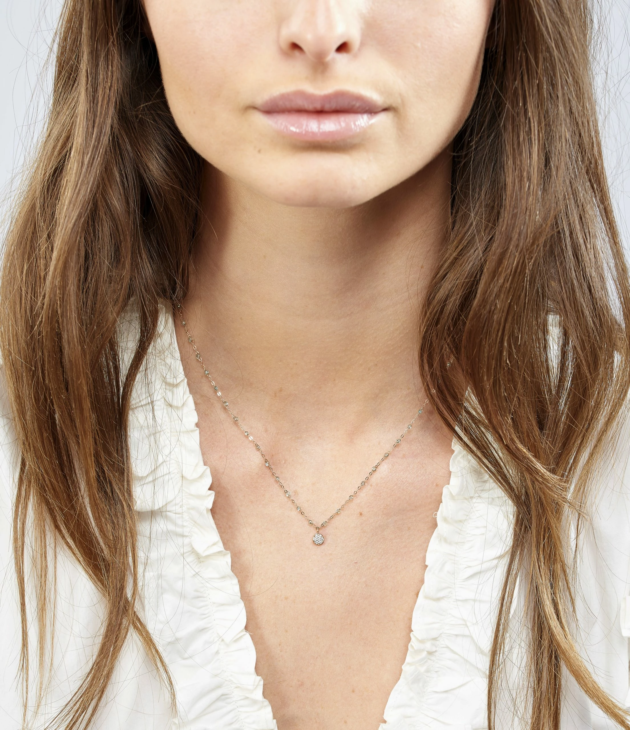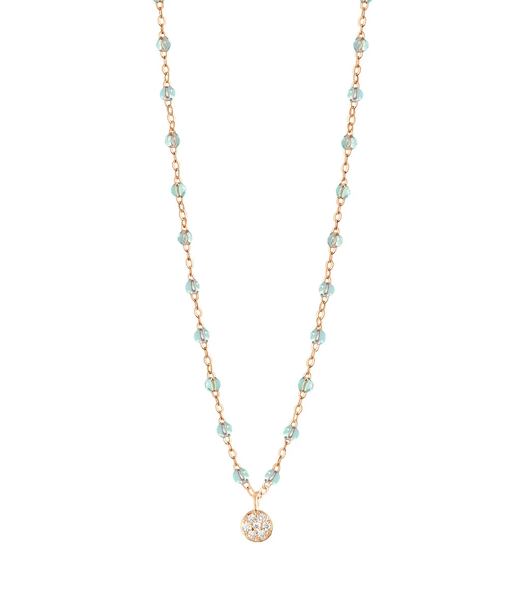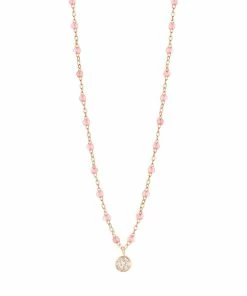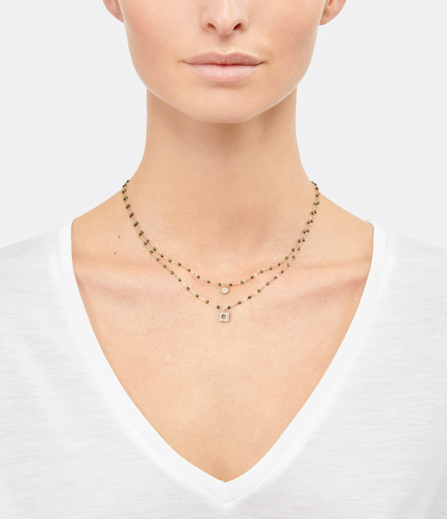 Collier sur chaîne en or gris, jaune ou rose agrémenté d’un motif serti de 7 diamants blancs et de perles de résine. Fermoir classique à ressort avec contre-anneau.