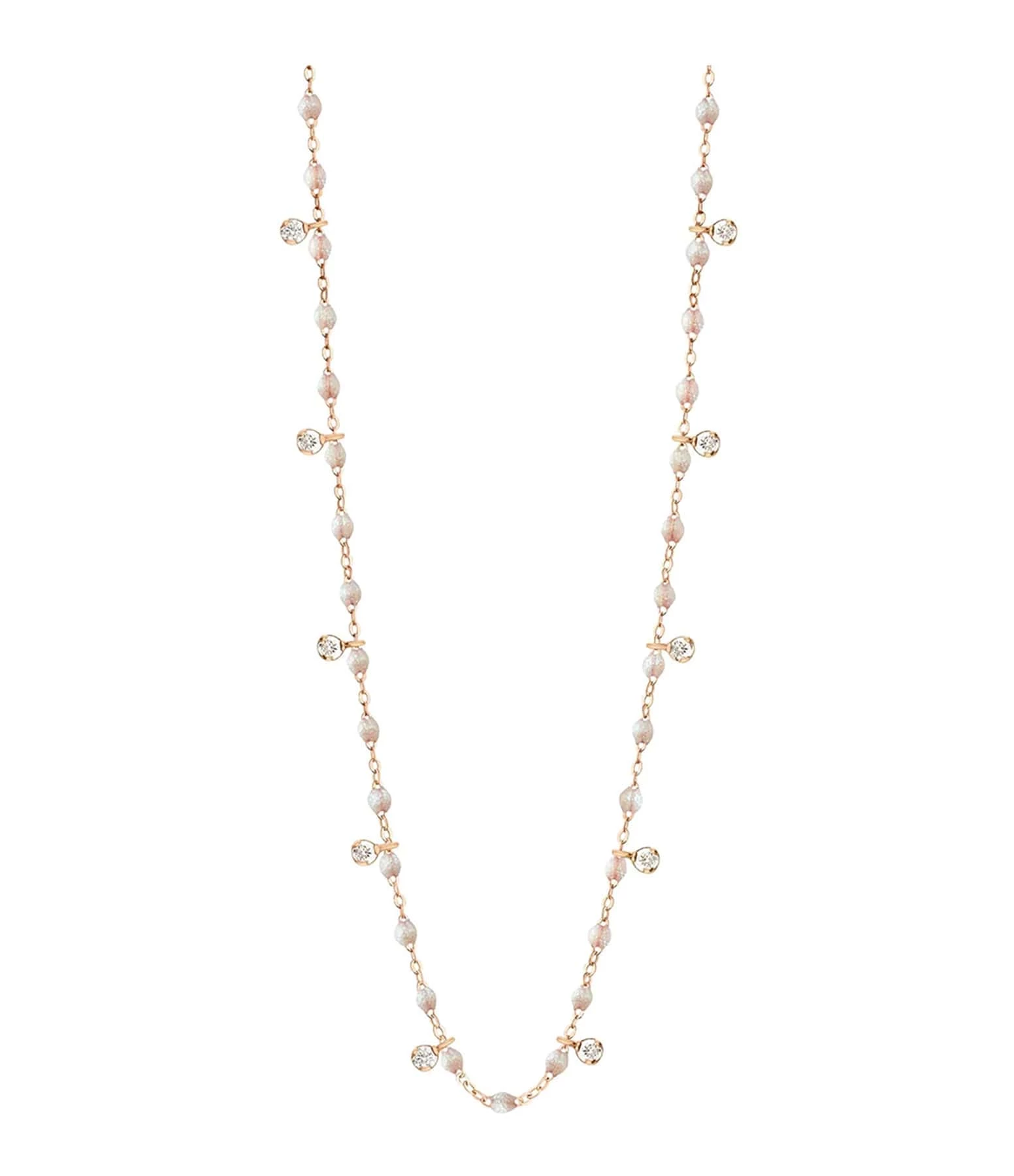 Collier sur chaîne en or blanc agrémenté de dix diamants blancs et de perles de résine. Fermoir classique à ressort avec contre-anneau.