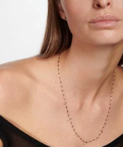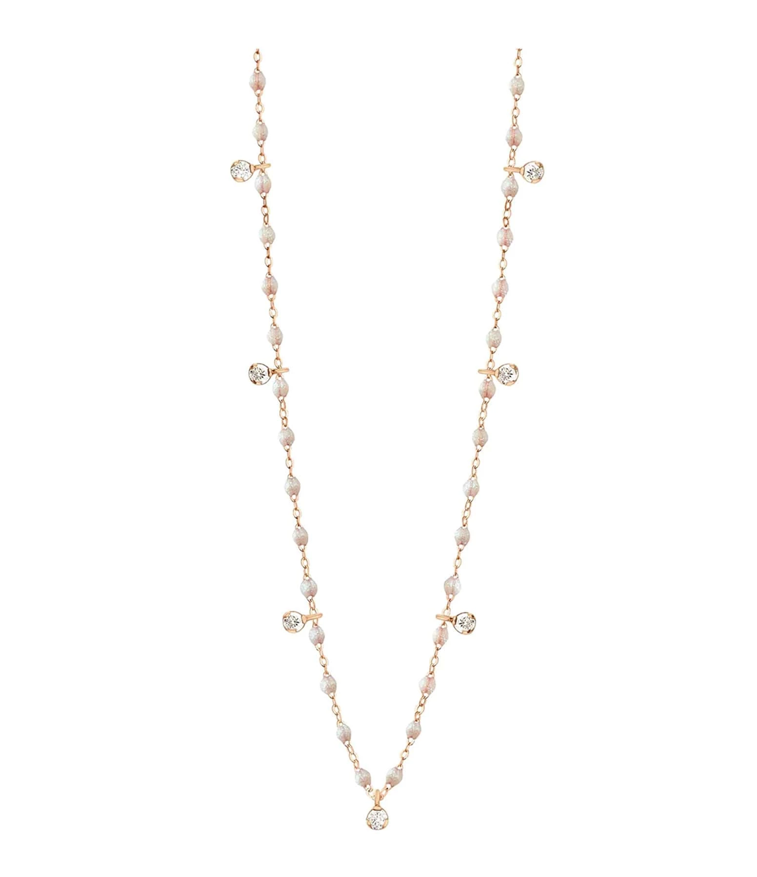 Collier sur chaîne en or rose agrémenté de sept diamants blancs et de perles de résine. Fermoir classique à ressort avec contre-anneau.