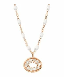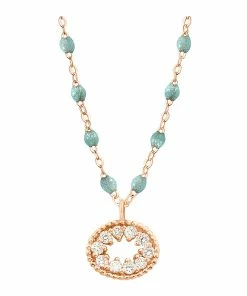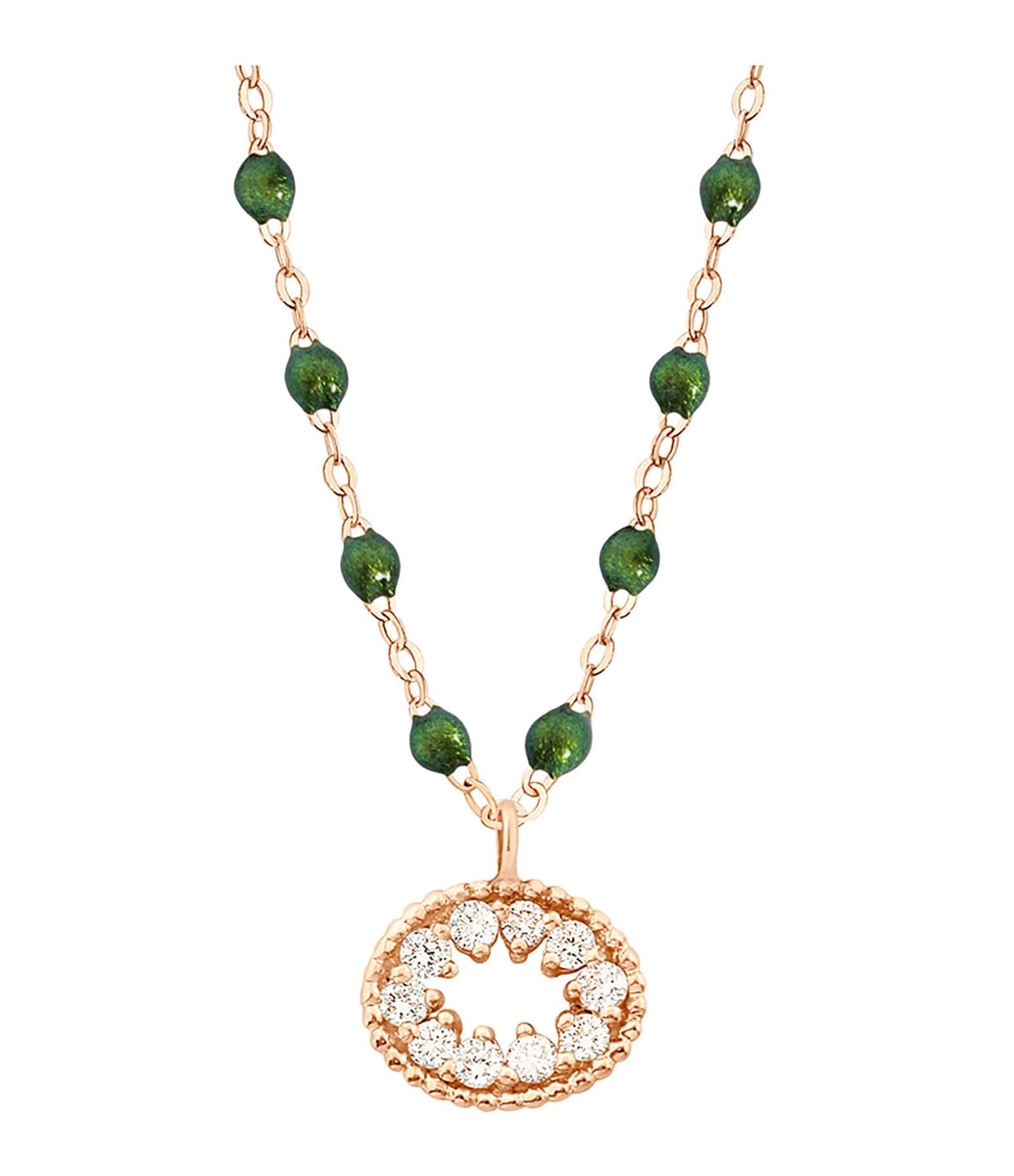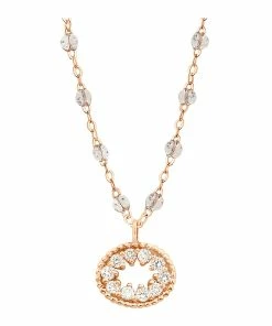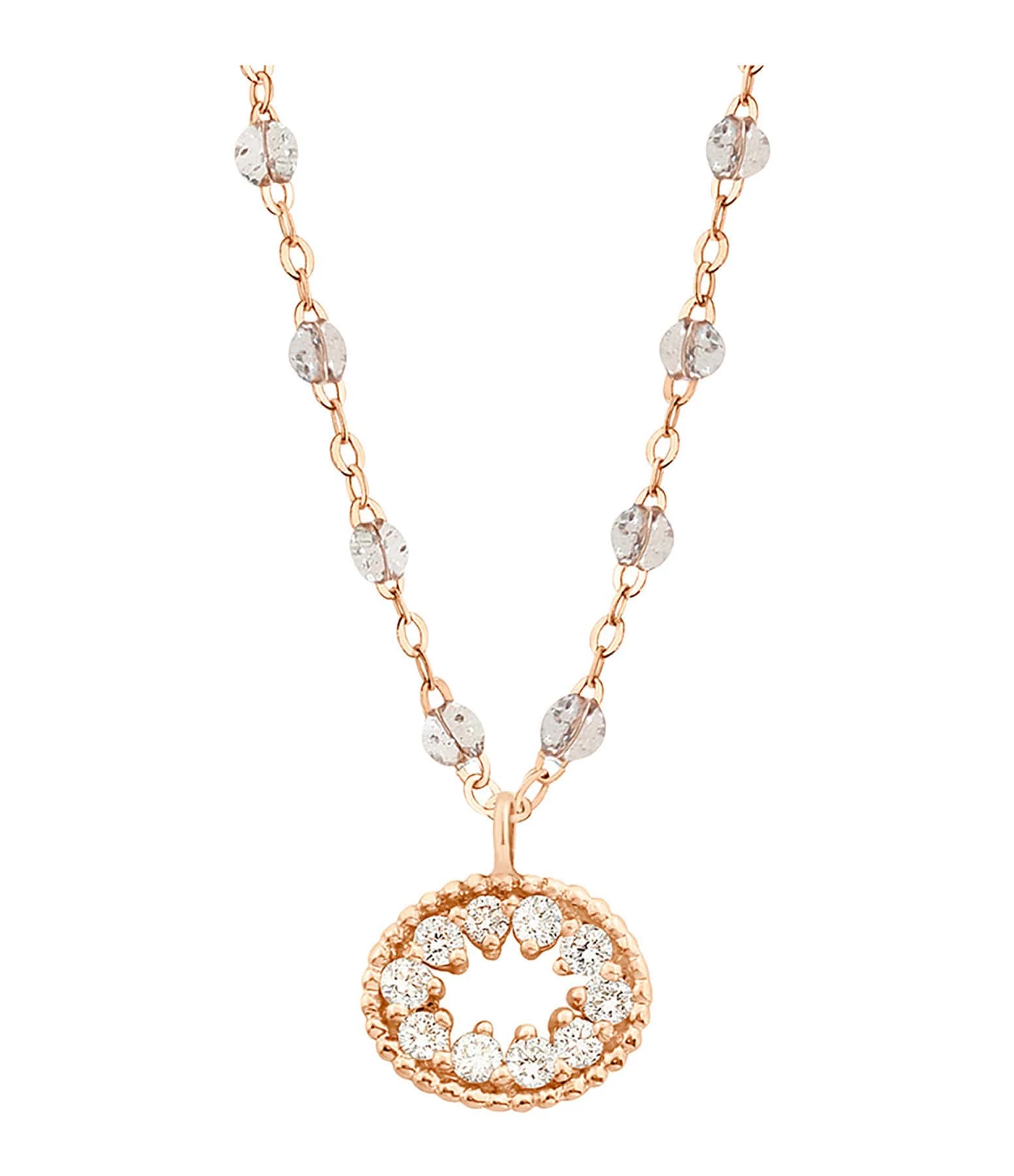 Collier sur chaîne en or rose agrémenté d’un pendentif en forme d’œil serti de diamants et de mini perles de résine. Fermoir classique à ressort avec contre-anneau.
