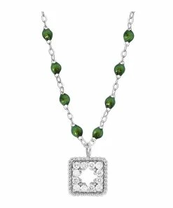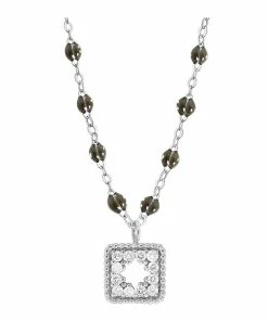 Collier sur chaîne en or blanc agrémenté d’un pendentif serti de diamants et de mini perles de résine. Fermoir classique à ressort avec contre-anneau.