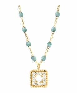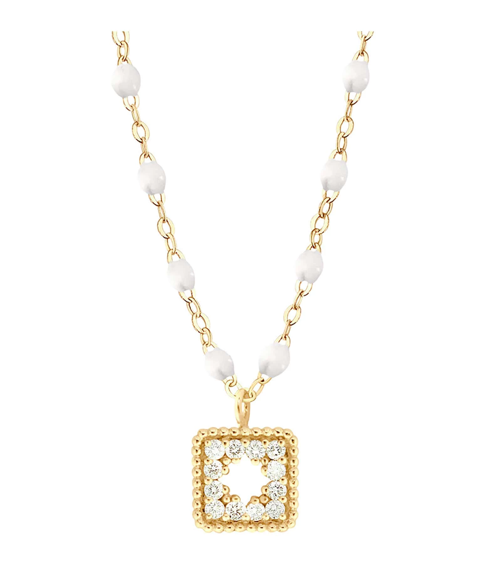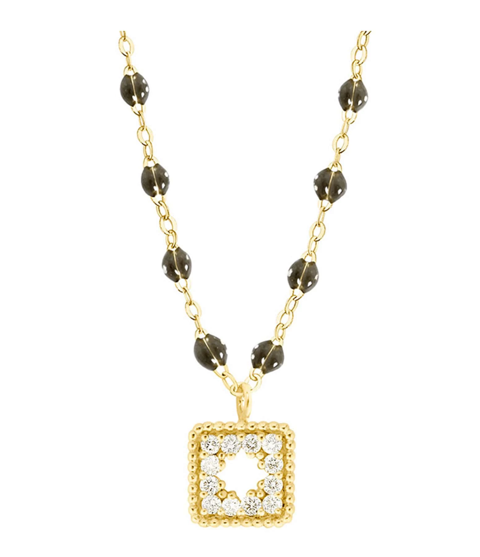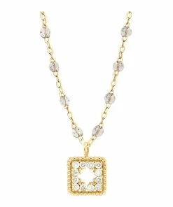Collier sur chaîne en or jaune agrémenté d’un pendentif serti de diamants et de mini perles de résine. Fermoir classique à ressort avec contre-anneau.
