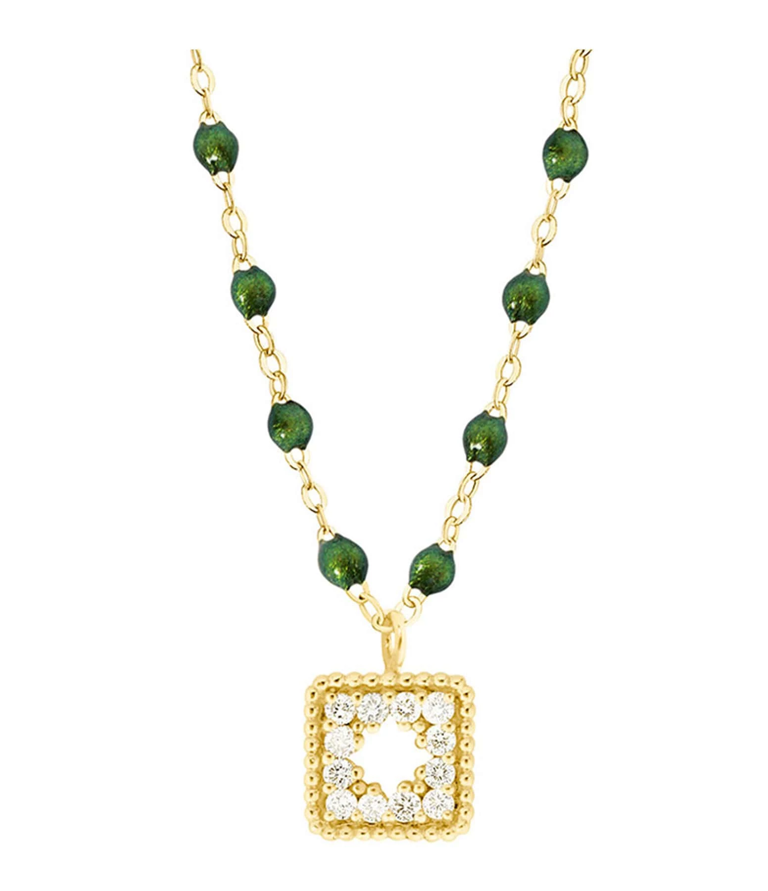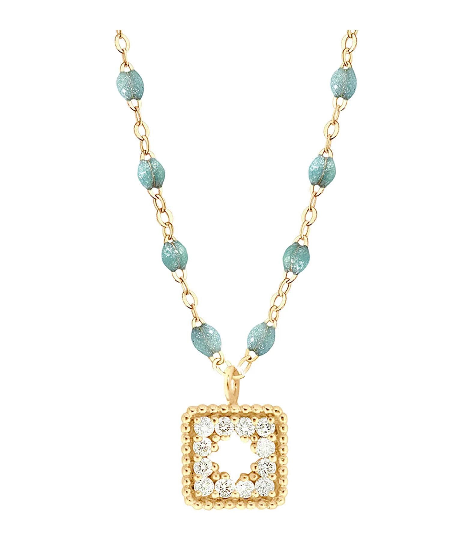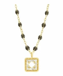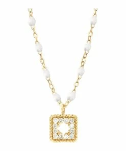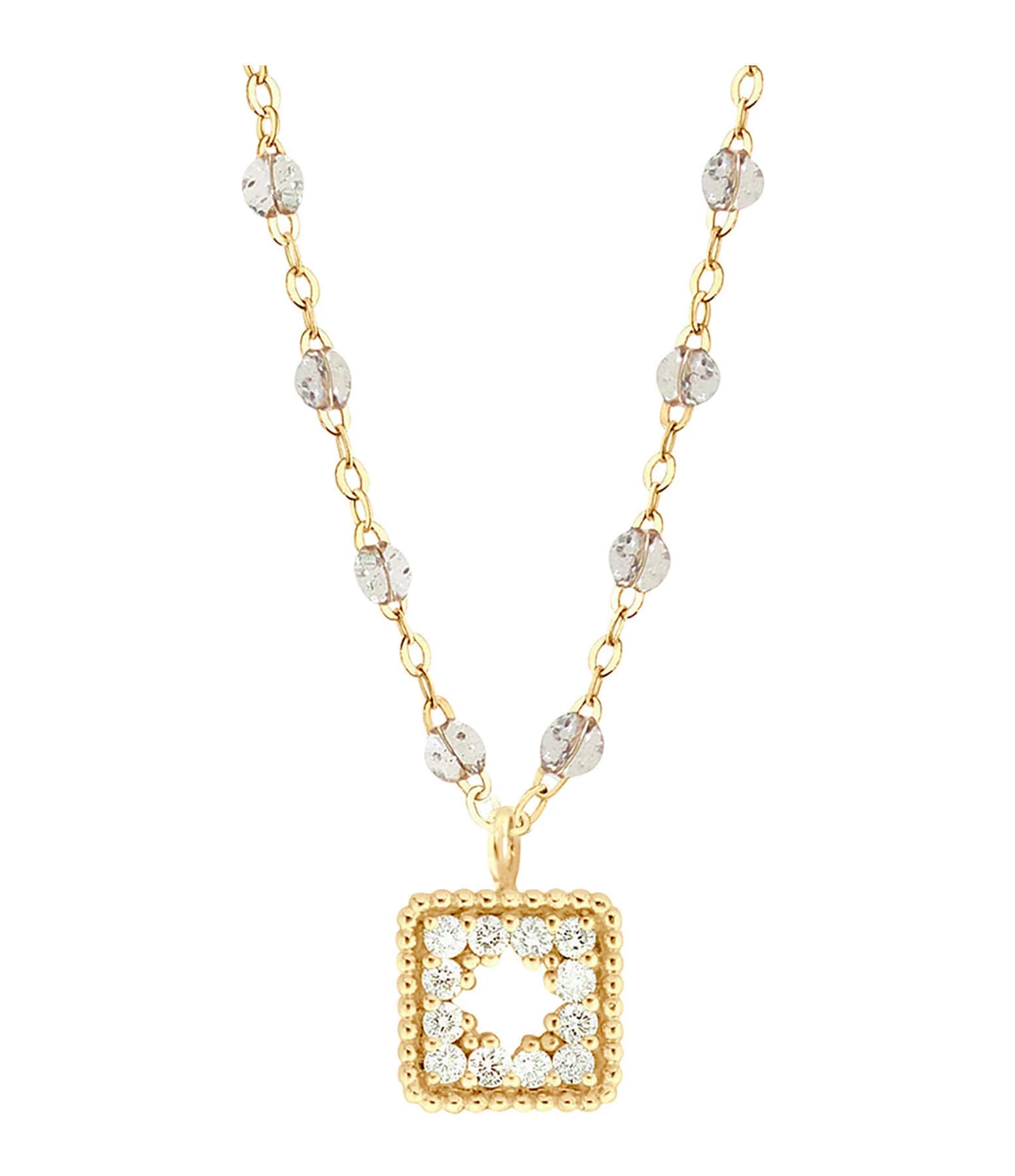 Collier sur chaîne en or jaune agrémenté d’un pendentif serti de diamants et de mini perles de résine. Fermoir classique à ressort avec contre-anneau.