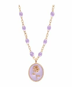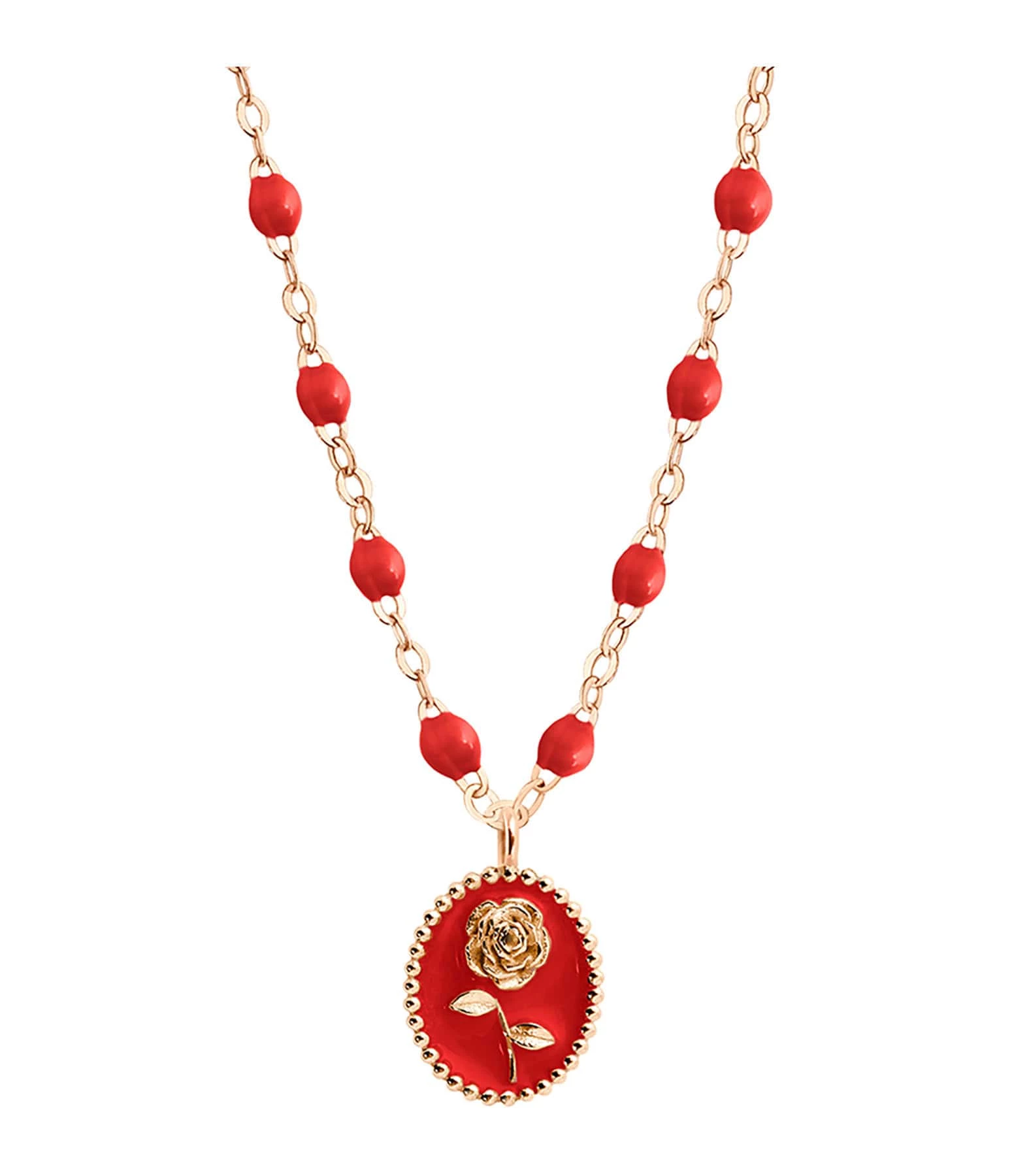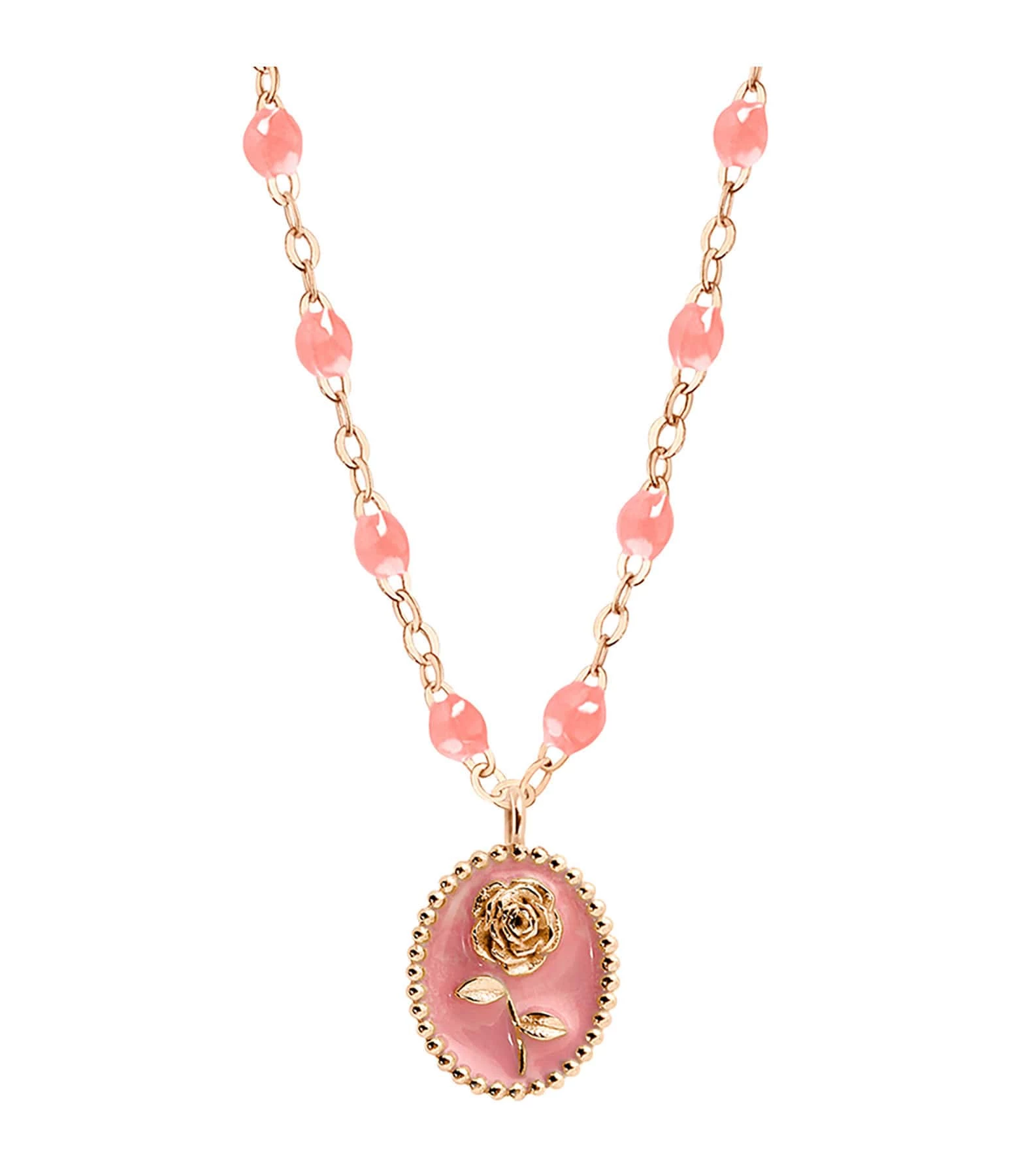 Collier sur chaîne en or rose agrémenté de perles de résine colorée et d’un pendentif en or rose et résine colorée avec une rose au centre. Fermoir classique à ressort avec contre anneau.