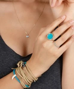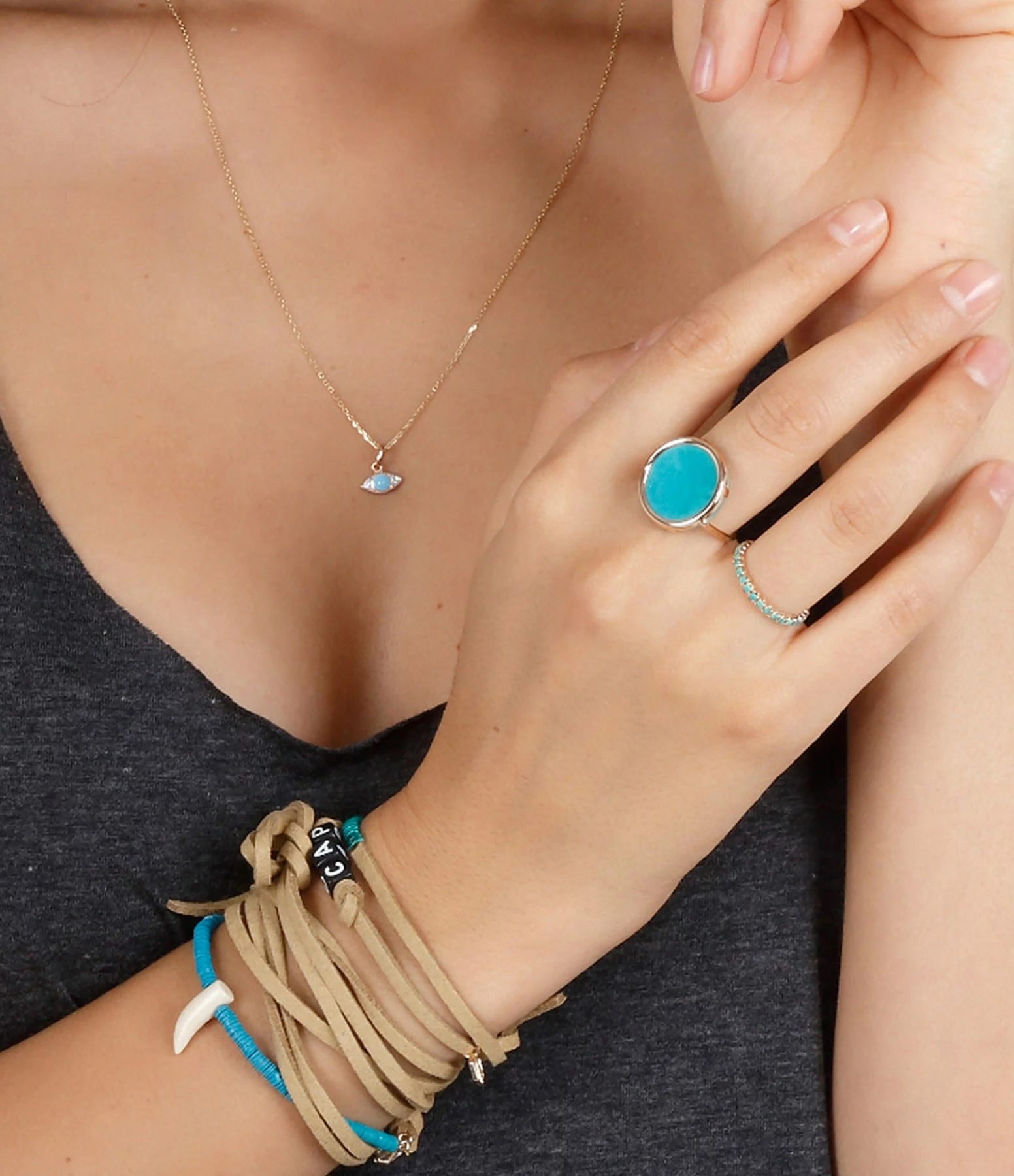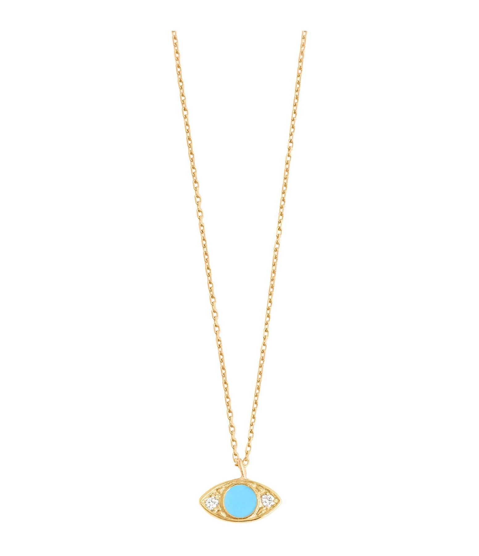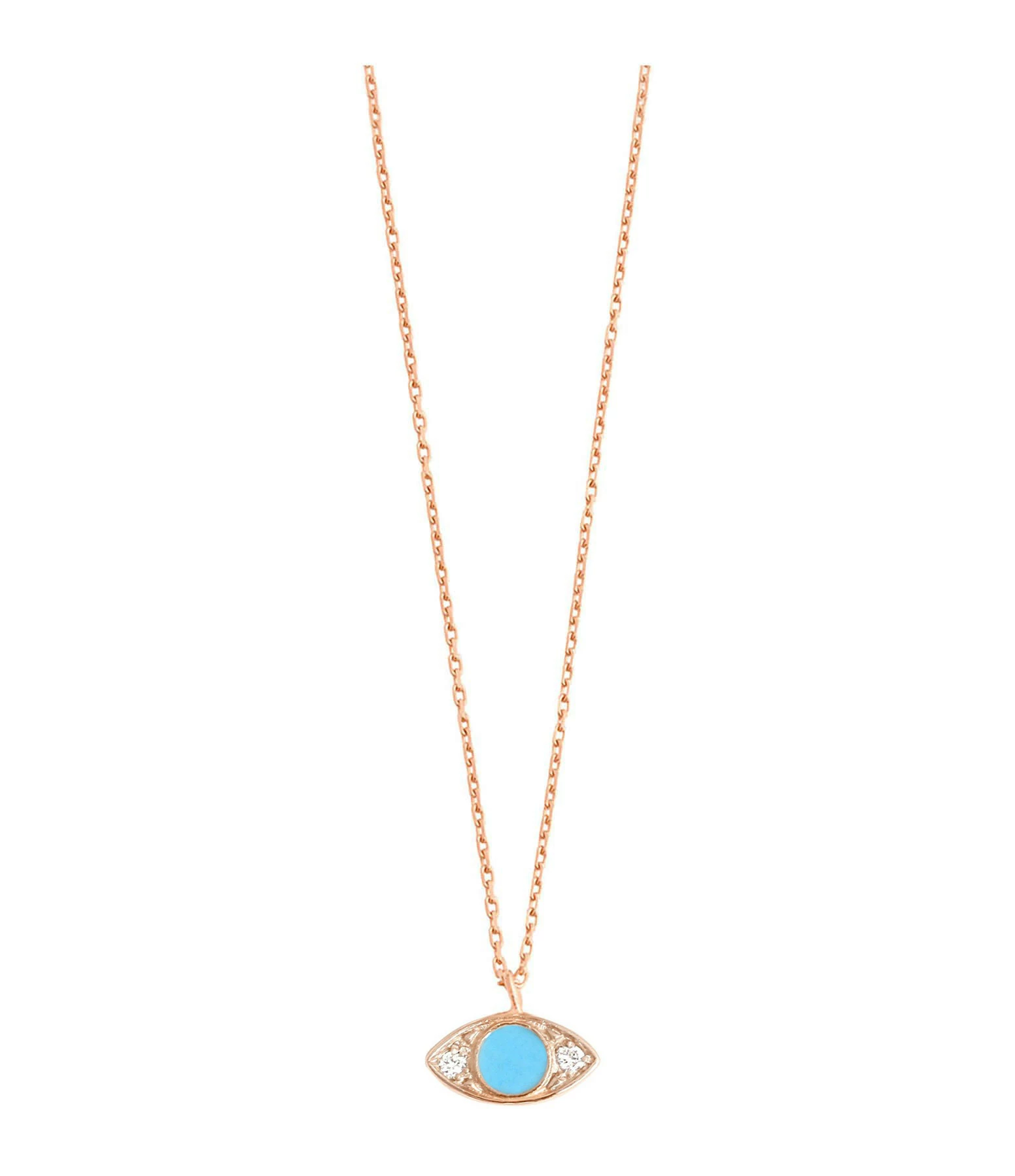 Collier sur chaîne en or rose, jaune ou gris agrémenté d’un pendentif Œil serti de deux diamants et de résine turquoise. Fermoir classique à ressort avec contre-anneau.