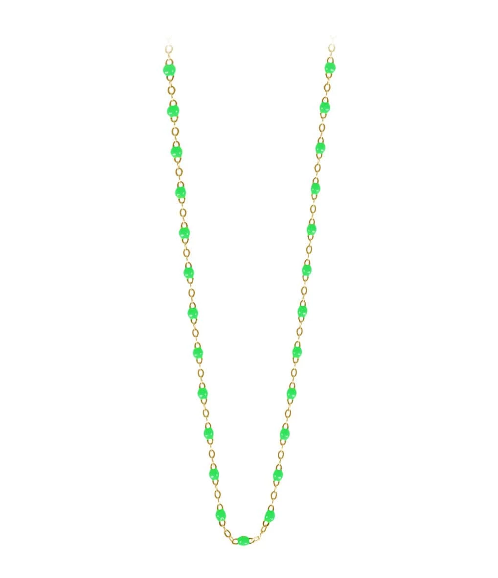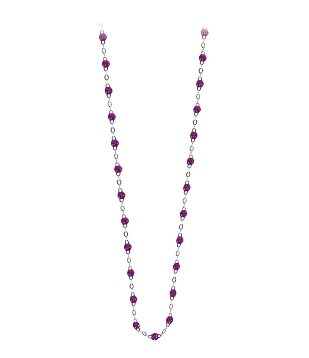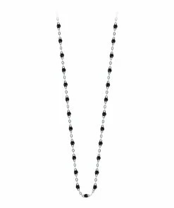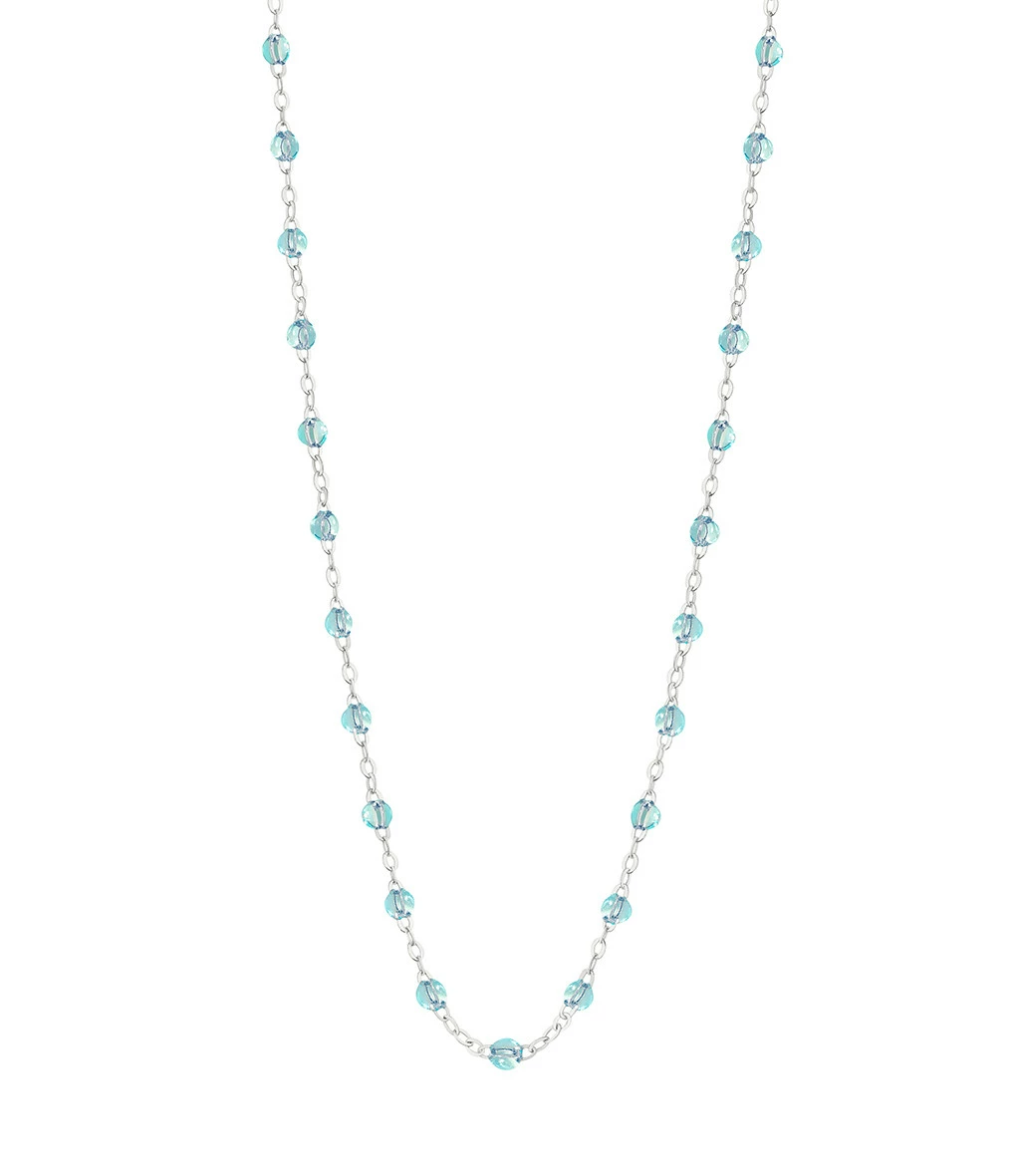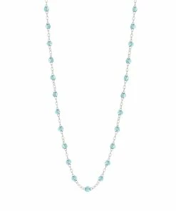 Sautoir sur chaîne en or gris, jaune ou rose agrémenté de perles de résine. Fermoir classique à ressort avec contre-anneau.La fabrication de ce modèle est limitée aux 27 couleurs de résine présentées.