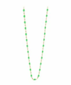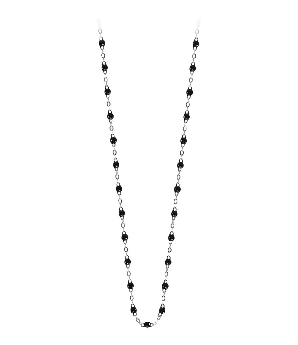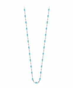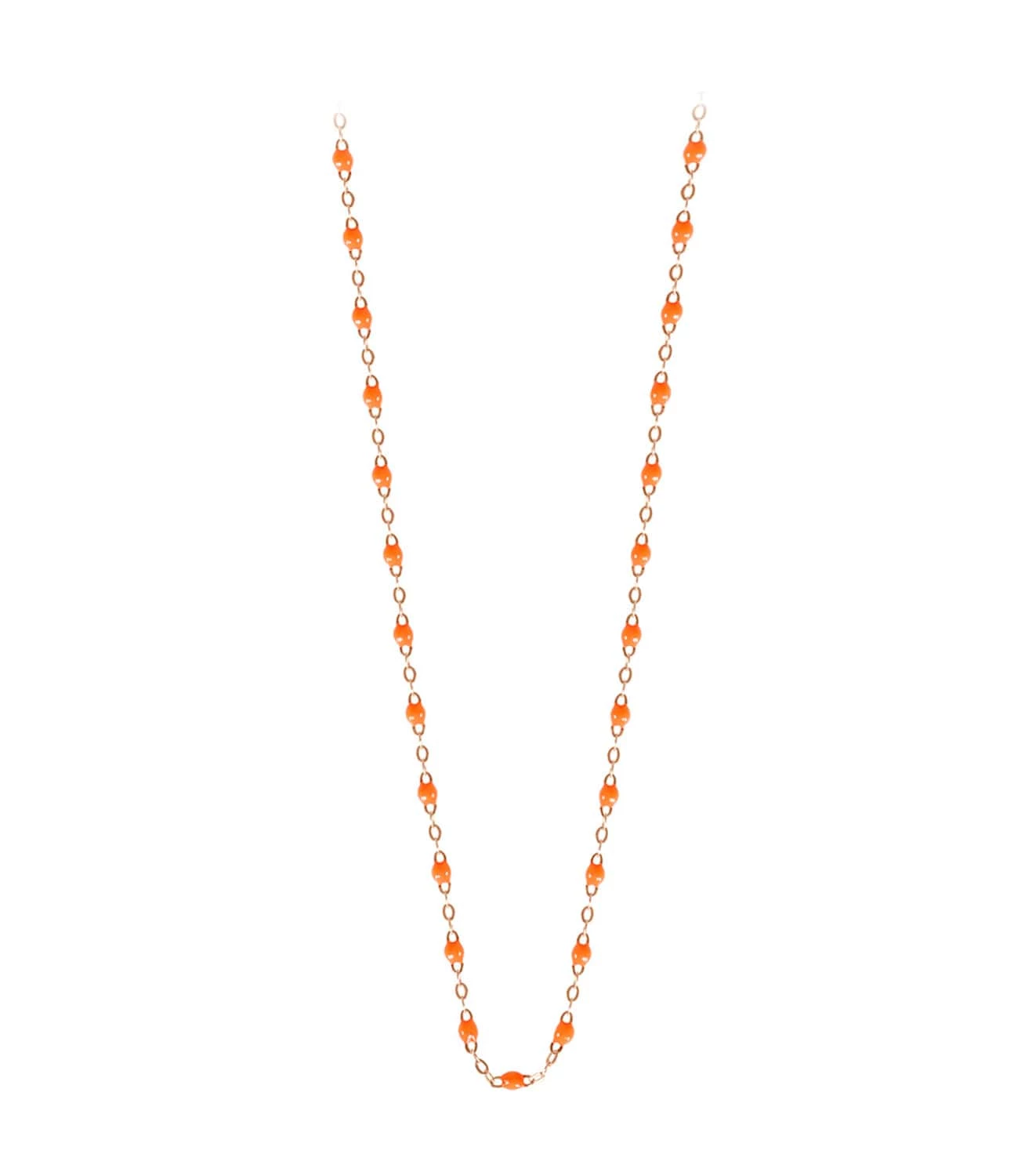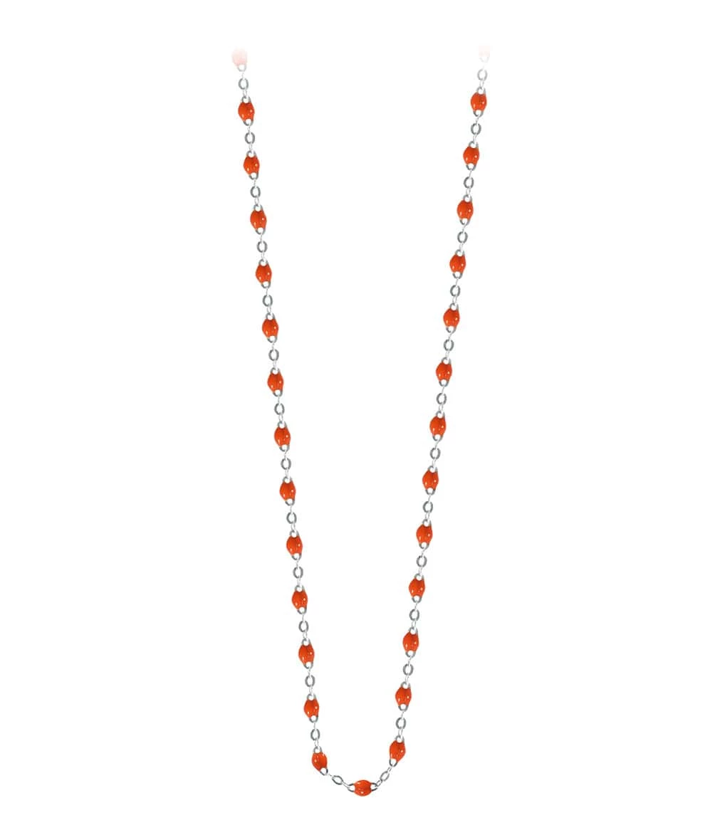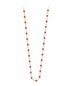 Sautoir sur chaîne en or gris, jaune ou rose agrémenté de perles de résine. Fermoir classique à ressort avec contre-anneau.La fabrication de ce modèle est limitée aux 27 couleurs de résine présentées.