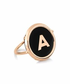 Bague en or rose avec disque en onyx et lettre au choix en or rose.