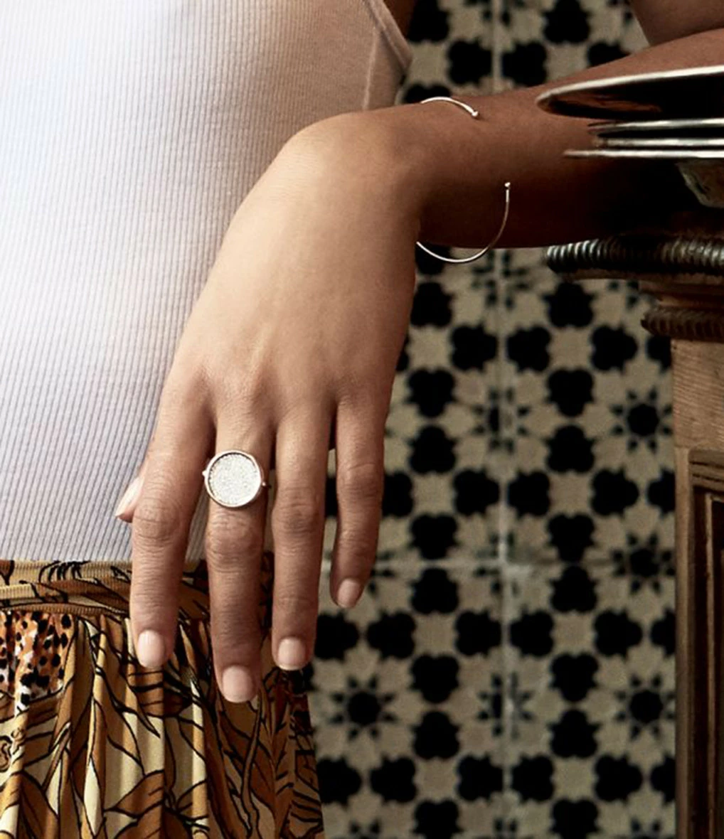 Bague en or rose avec disque serti de diamants blancs.