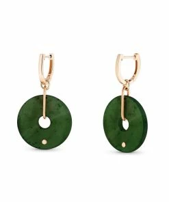 Boucles d’oreilles en or rose avec pendentif disque en pierre de jade verte. Fermoir cliquet.