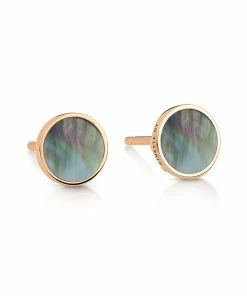 Boucles d’oreilles rondes en or rose agrémentées d’une pierre de nacre noire. Fermoir poussette.