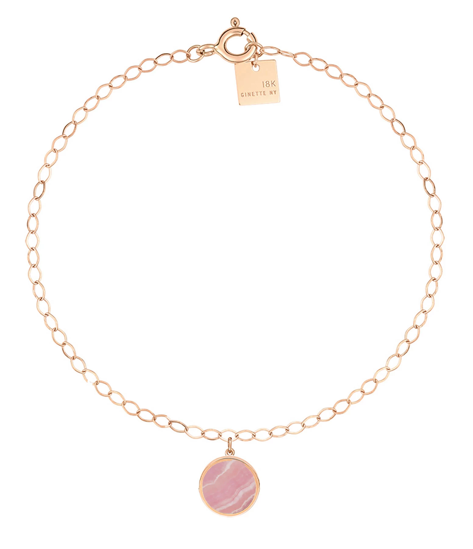 Bracelet de cheville sur chaîne en or rose avec un pendentif en pierre de rhodochrosite rose. Fermoir classique à ressort.