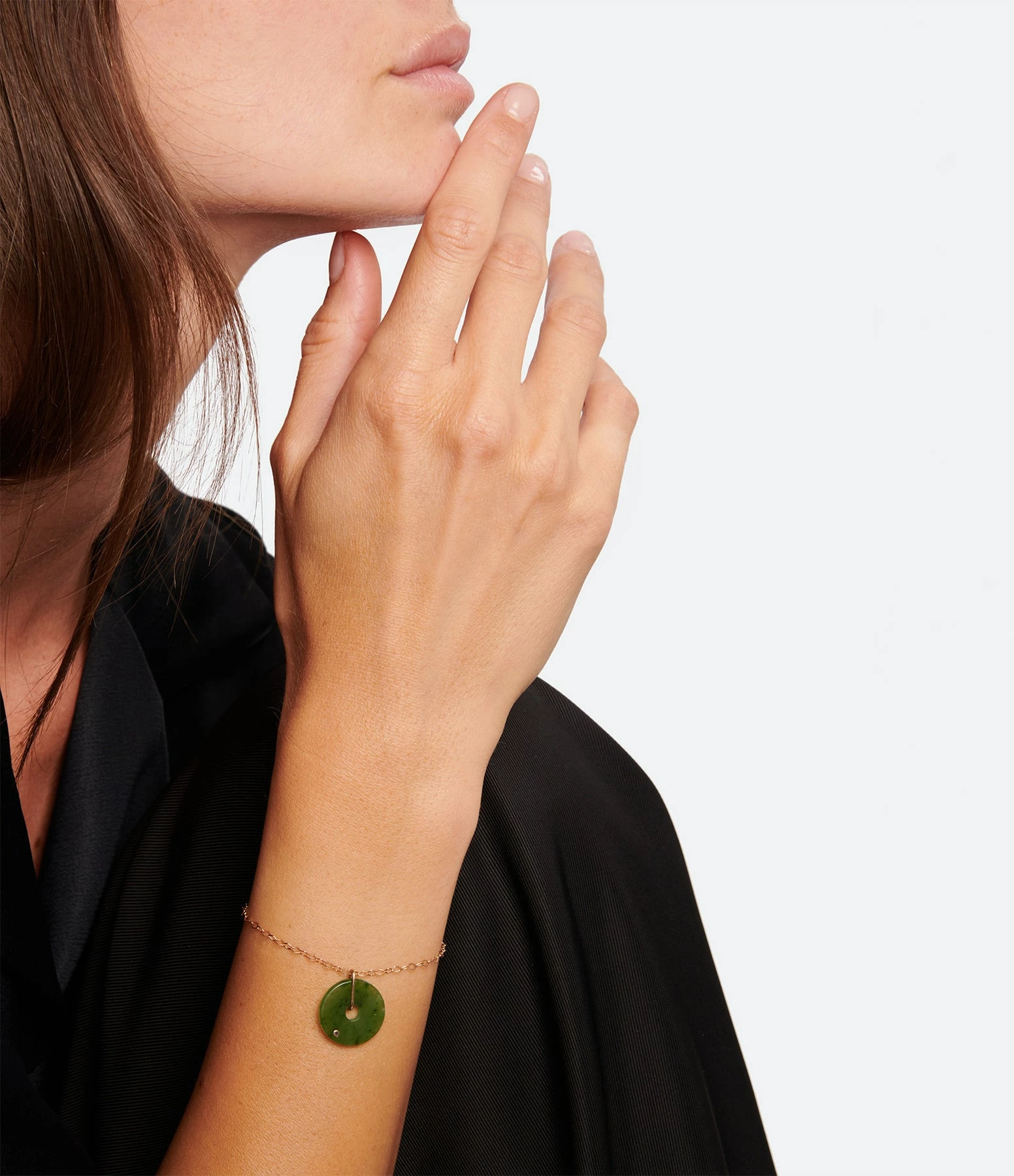 Bracelet chaîne en or rose, avec pendentif disque en pierre de jade verte. Fermoir classique à ressort.